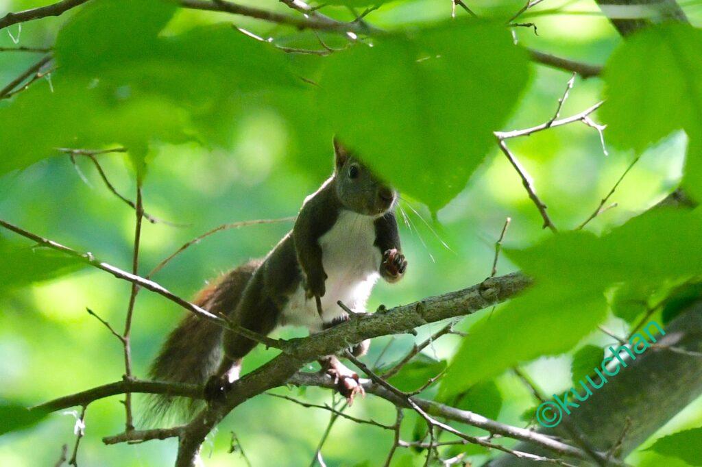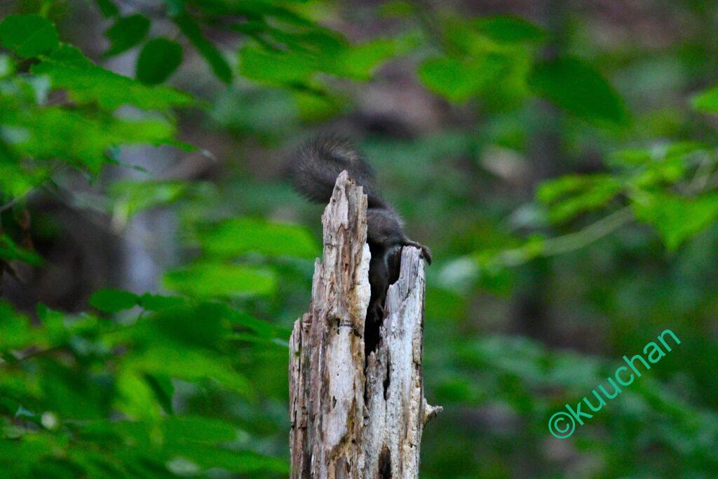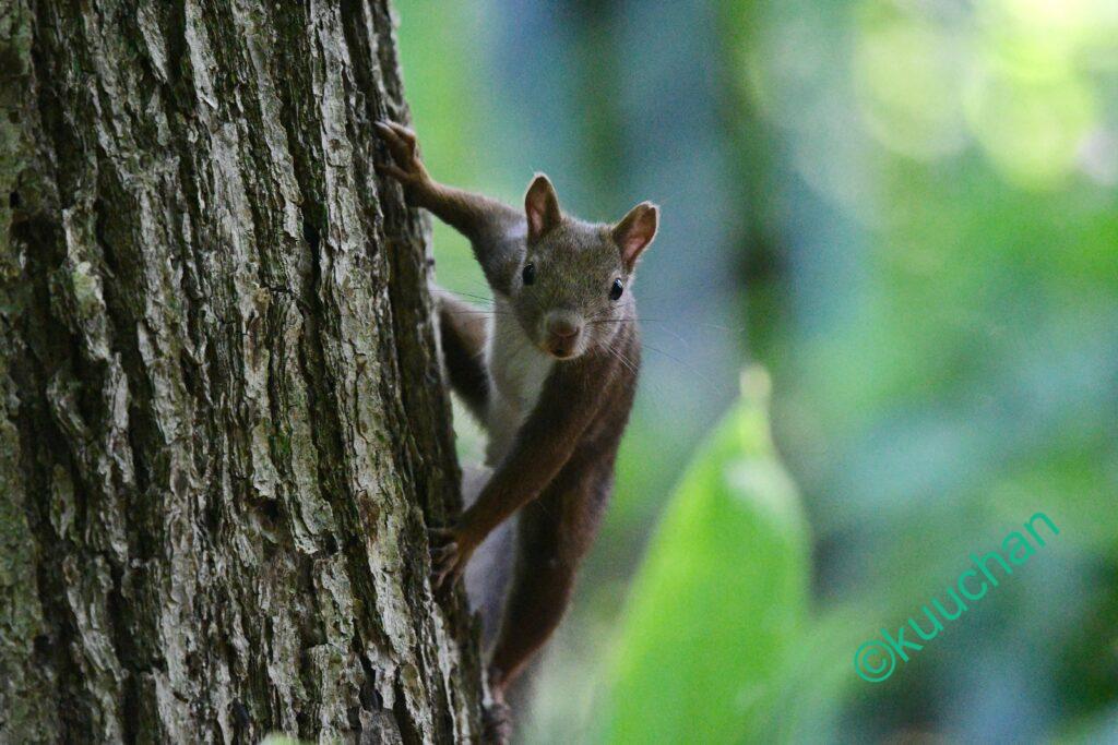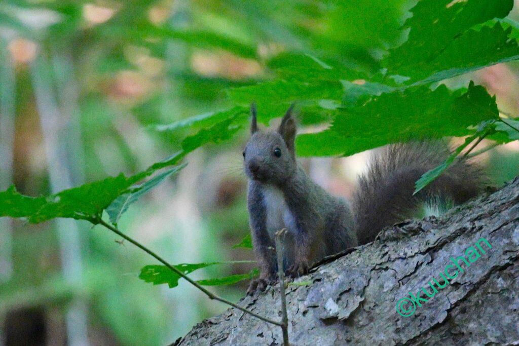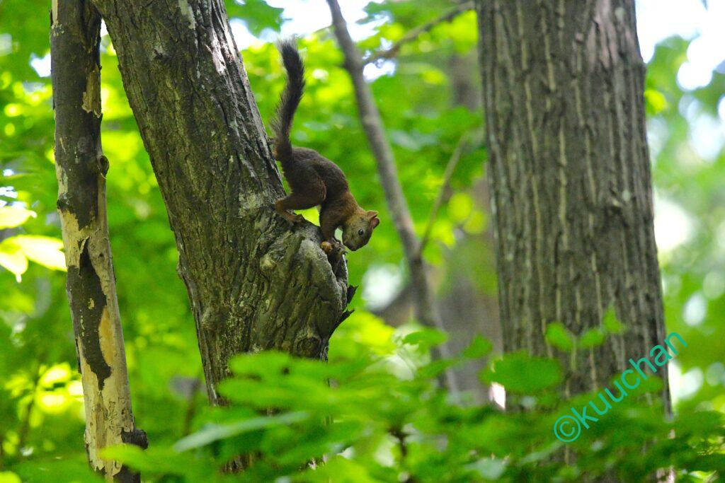 森を歩きながら、あの母リスは無事に子育てできたかなと考えている時にスルスルと木から降りてきてくれました。