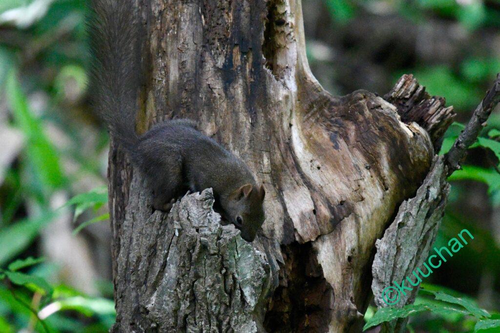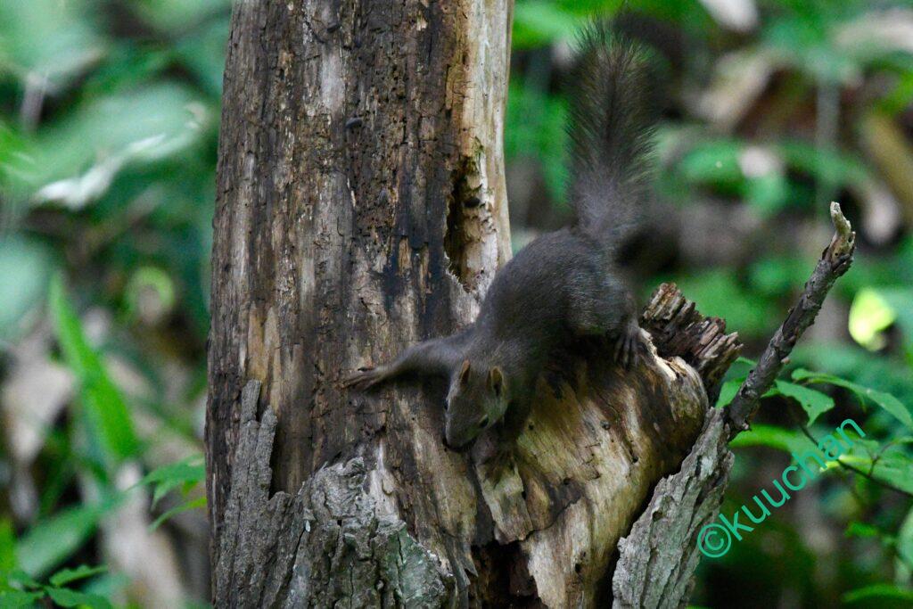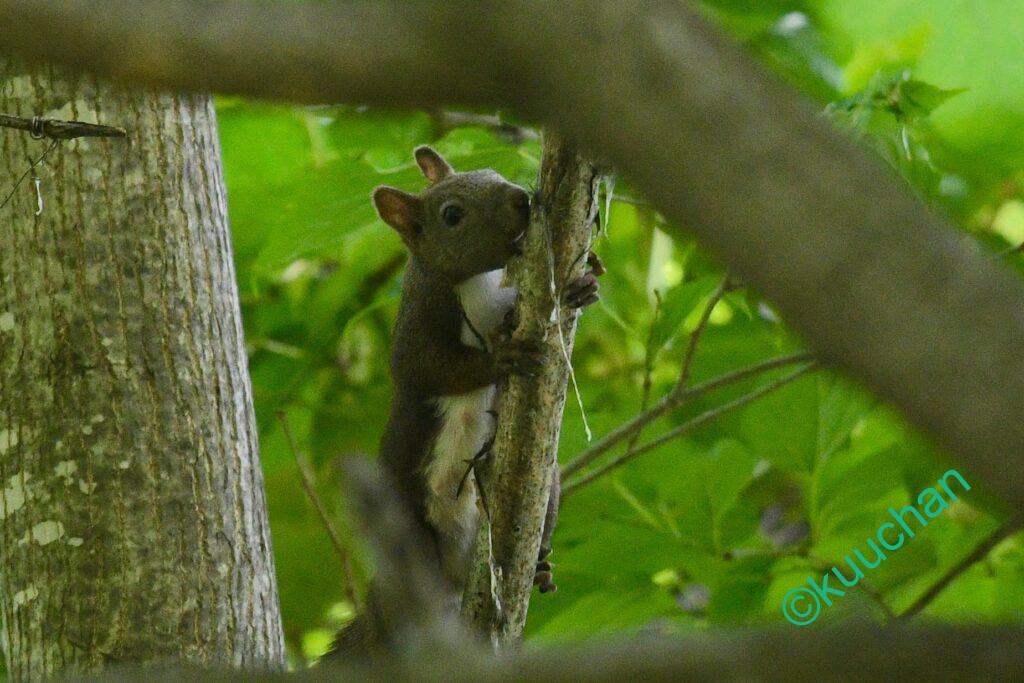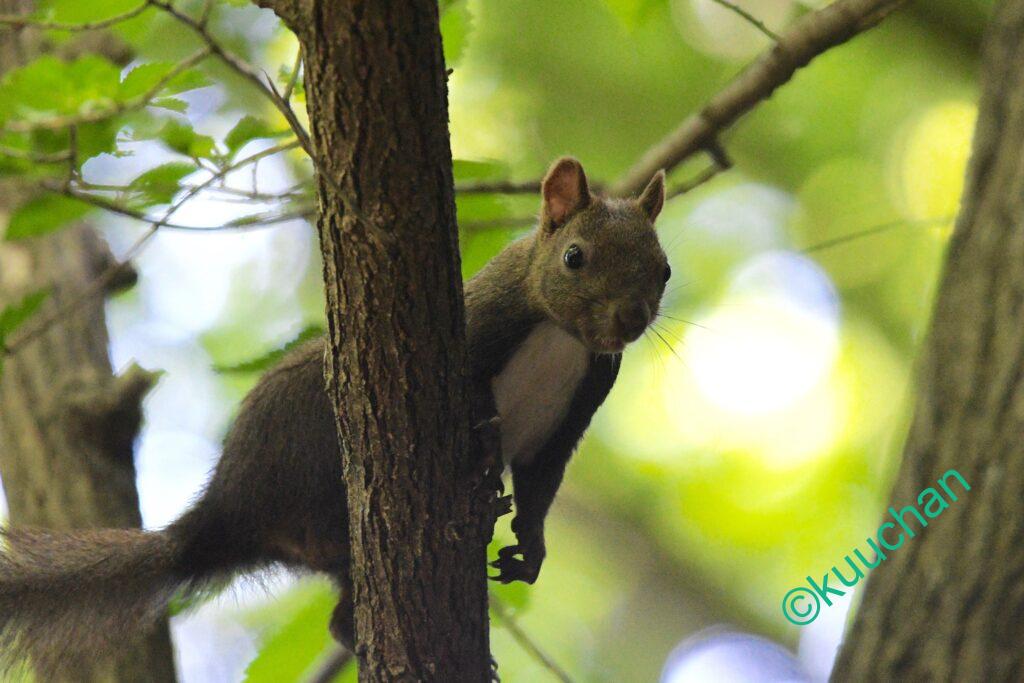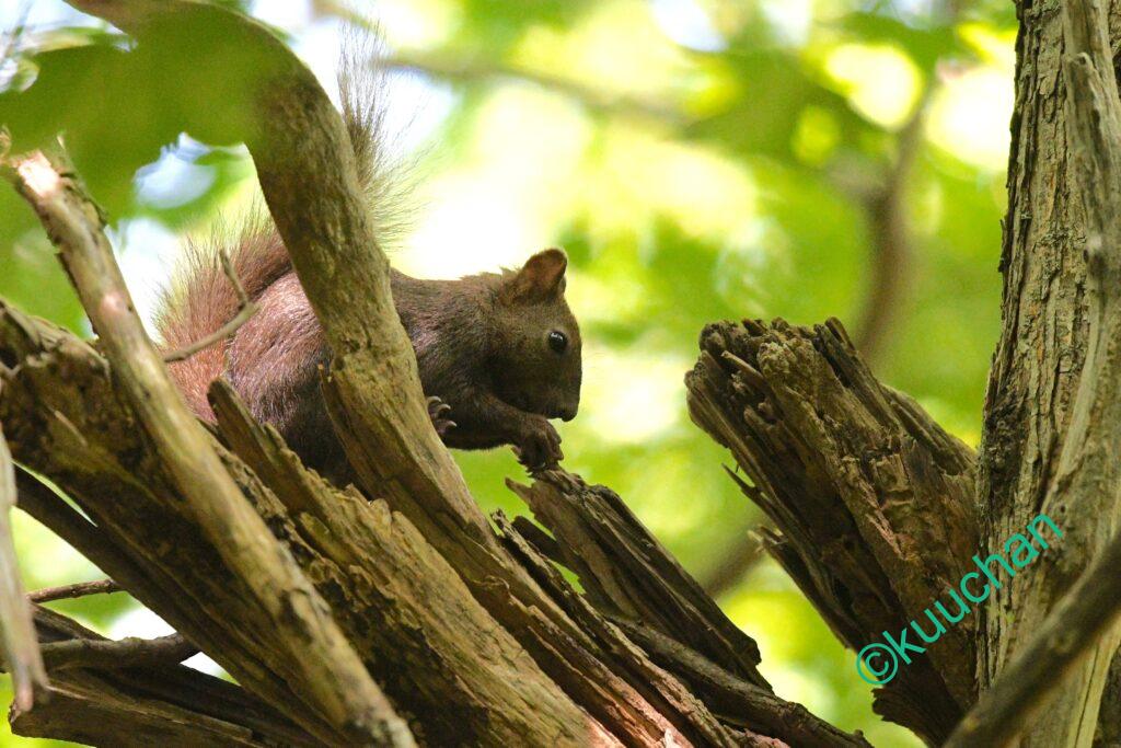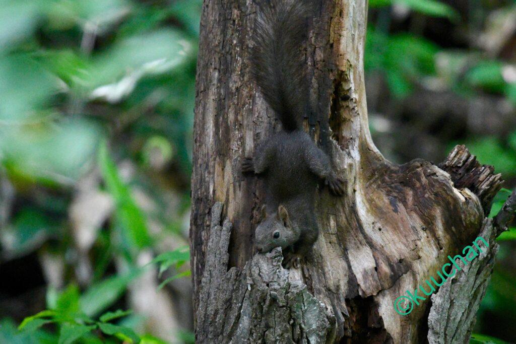 森を歩きながら、あの母リスは無事に子育てできたかなと考えている時にスルスルと木から降りてきてくれました。
