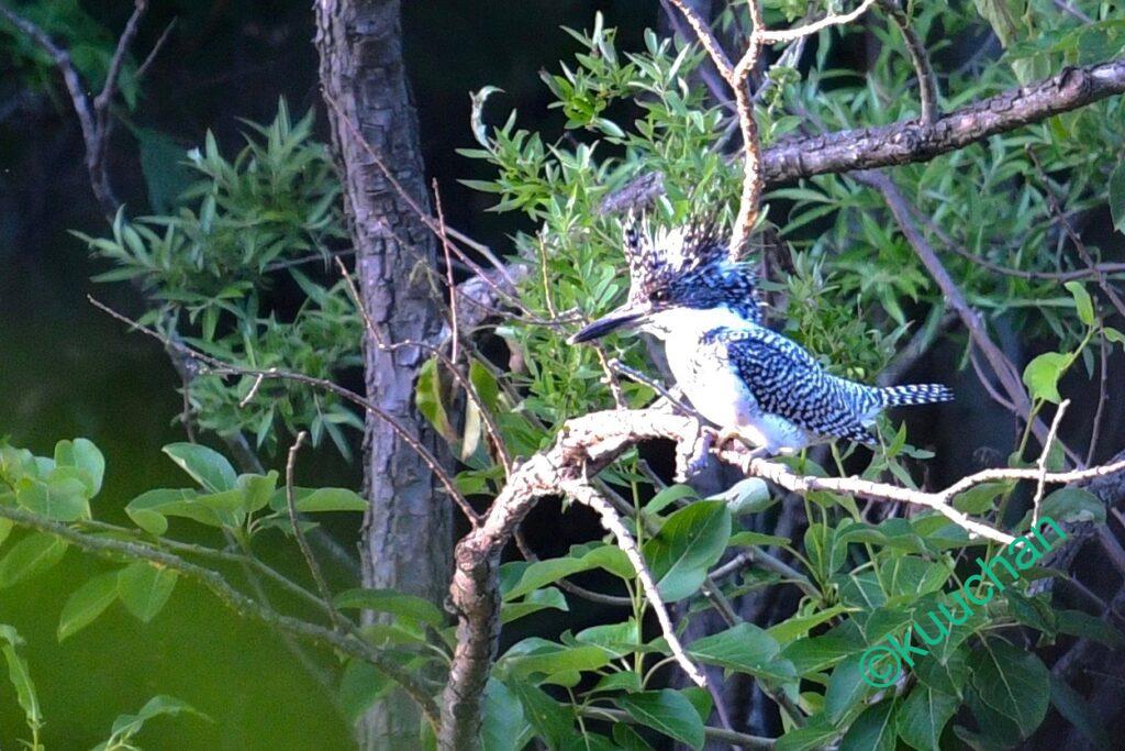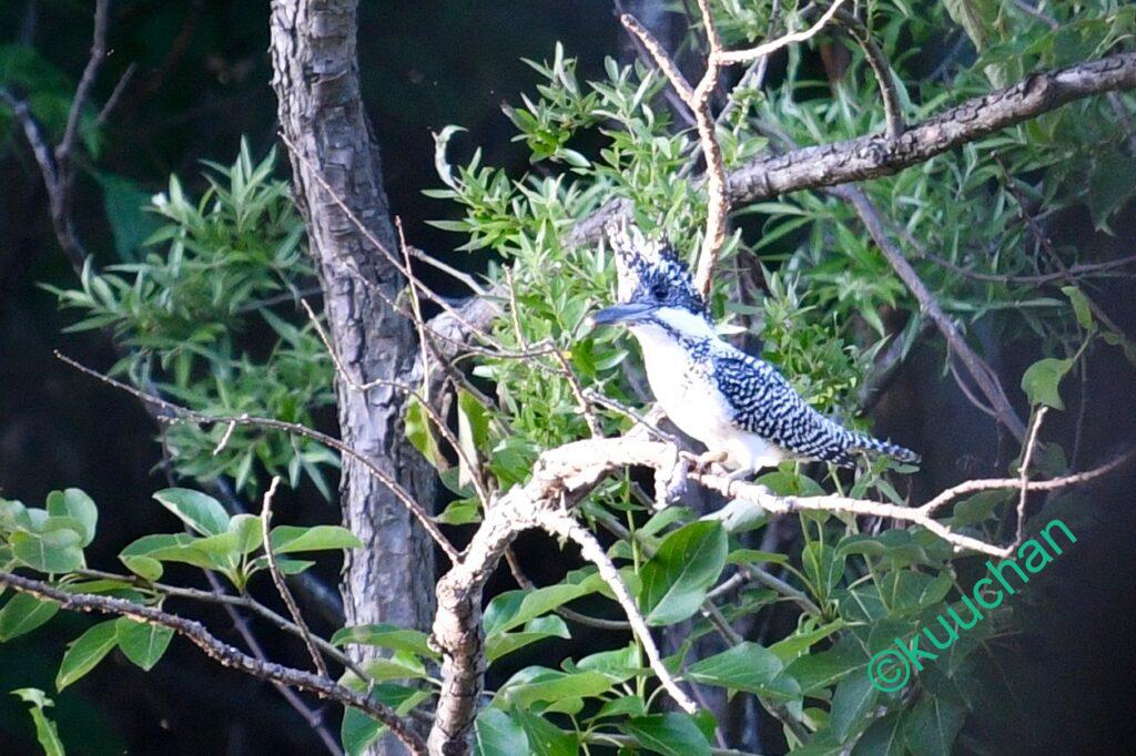 木の葉で見えづらいけれど、そのせいかヤマセミもこちらを警戒したそぶりもなく、水面を見つめていました。