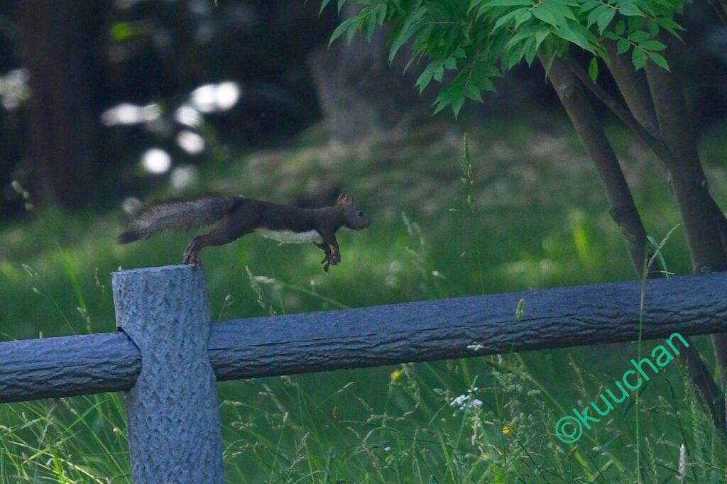 何かに驚いたのか、急に柵の上を走り出した。