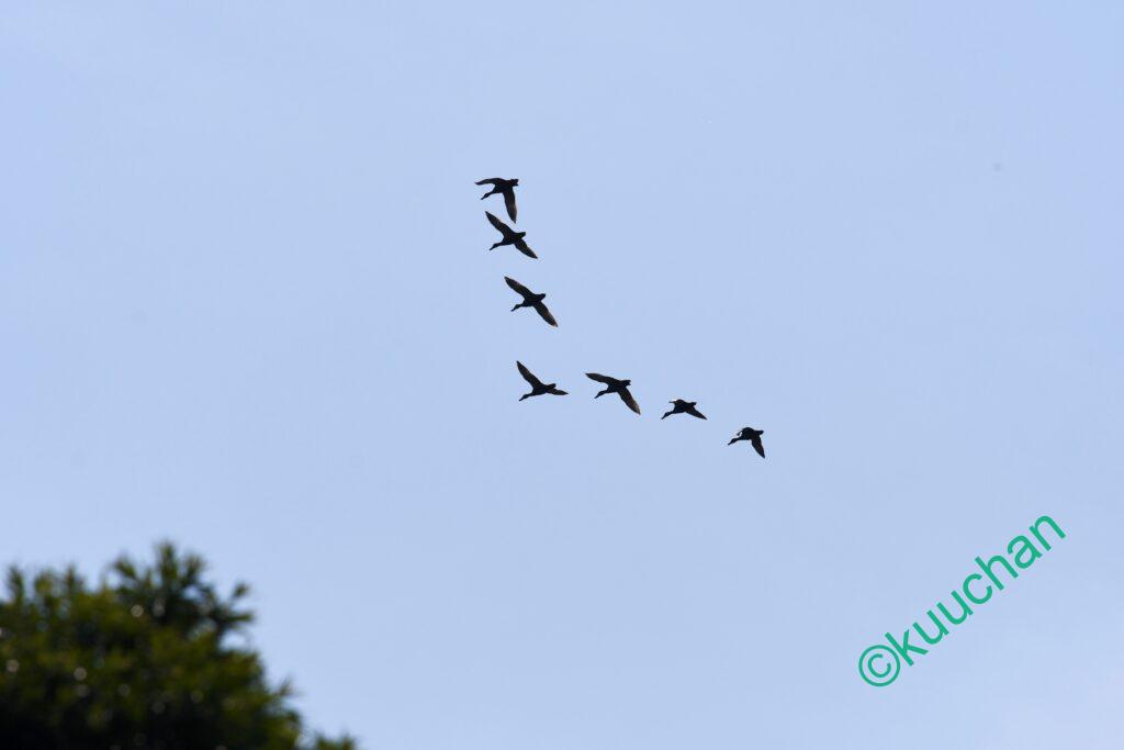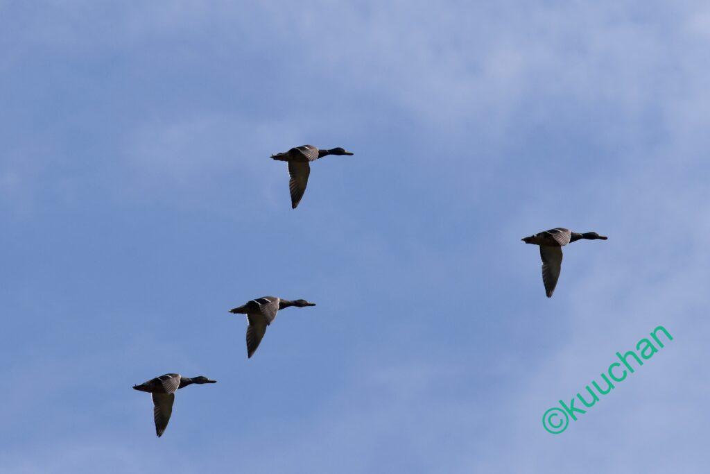 上空ではカモの群れが旋回中。