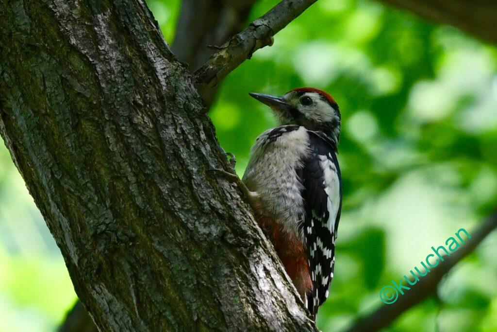 アカゲラの幼鳥は頭部を見るとわかります。