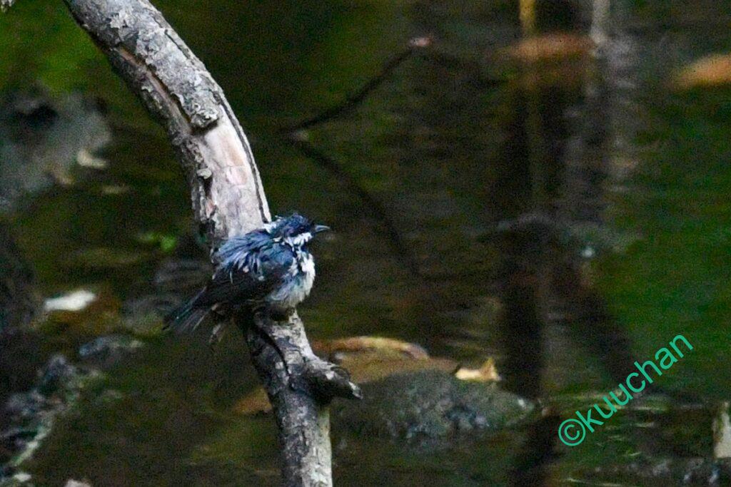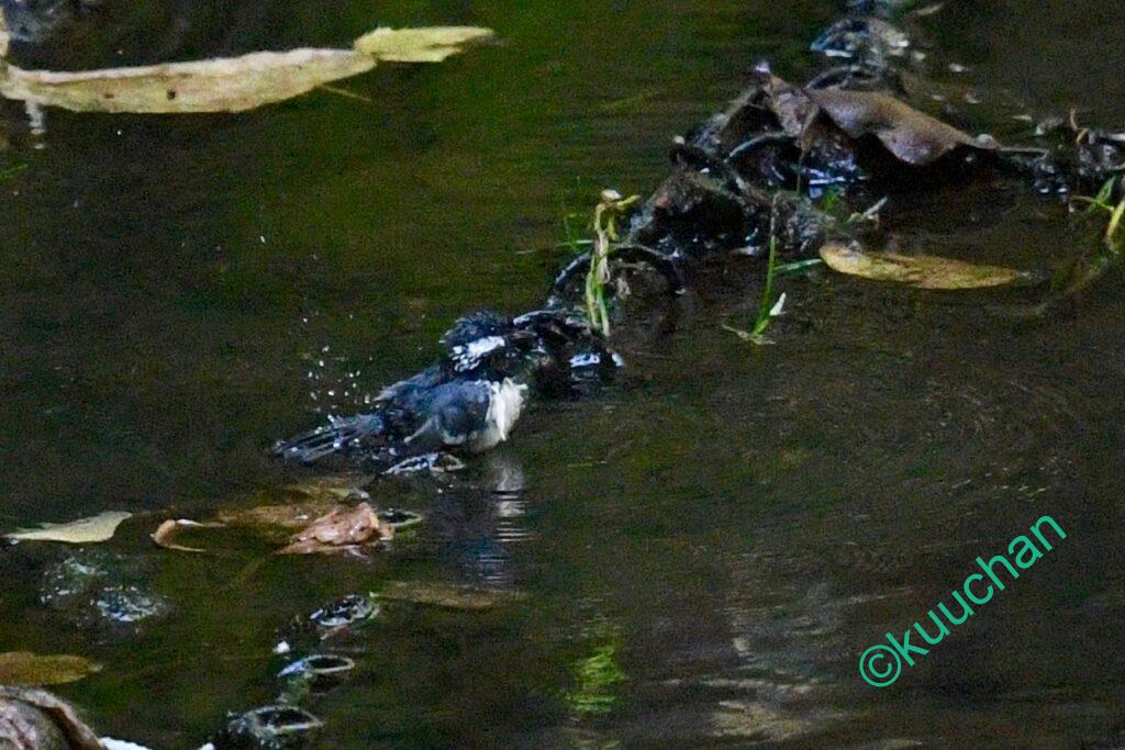 ちょうど枝葉がかぶる場所で写真が撮れなかったのですが、タイミングよくすぐ横でシジュウカラも水浴びを開始!!