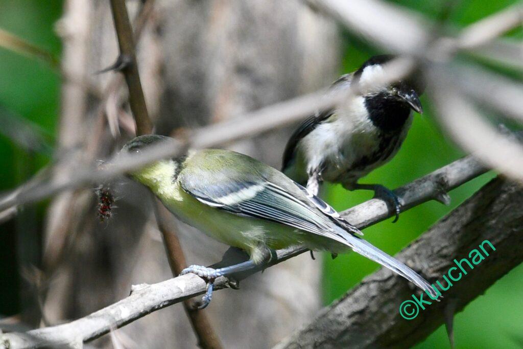 親の後をついてまわったり、エサをもらう様子を見て、ああ子どもだなと思うのですが、シジュウカラだけは親と色が違うのでわかりやすいですね。