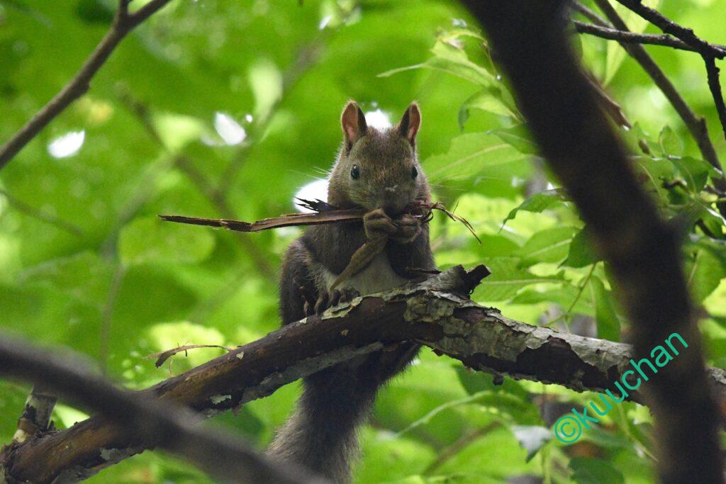 今日も出会ったエゾリスは、寝床の巣を作るための木の皮を集めていました…と、思ったのですが。