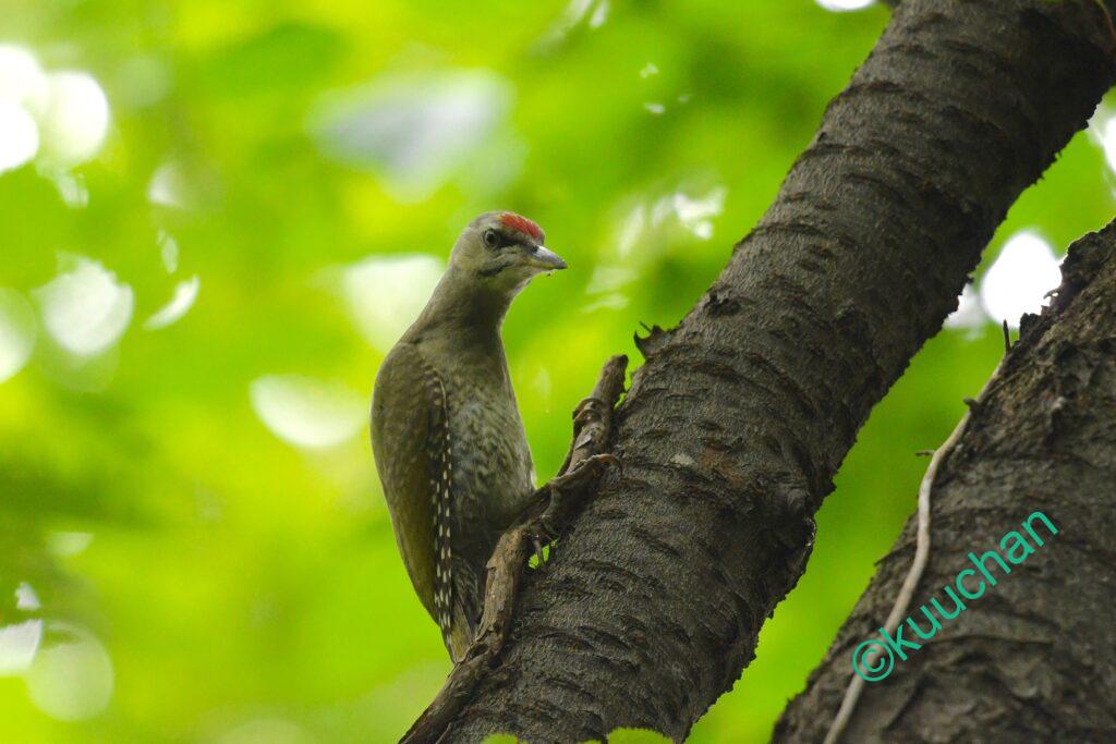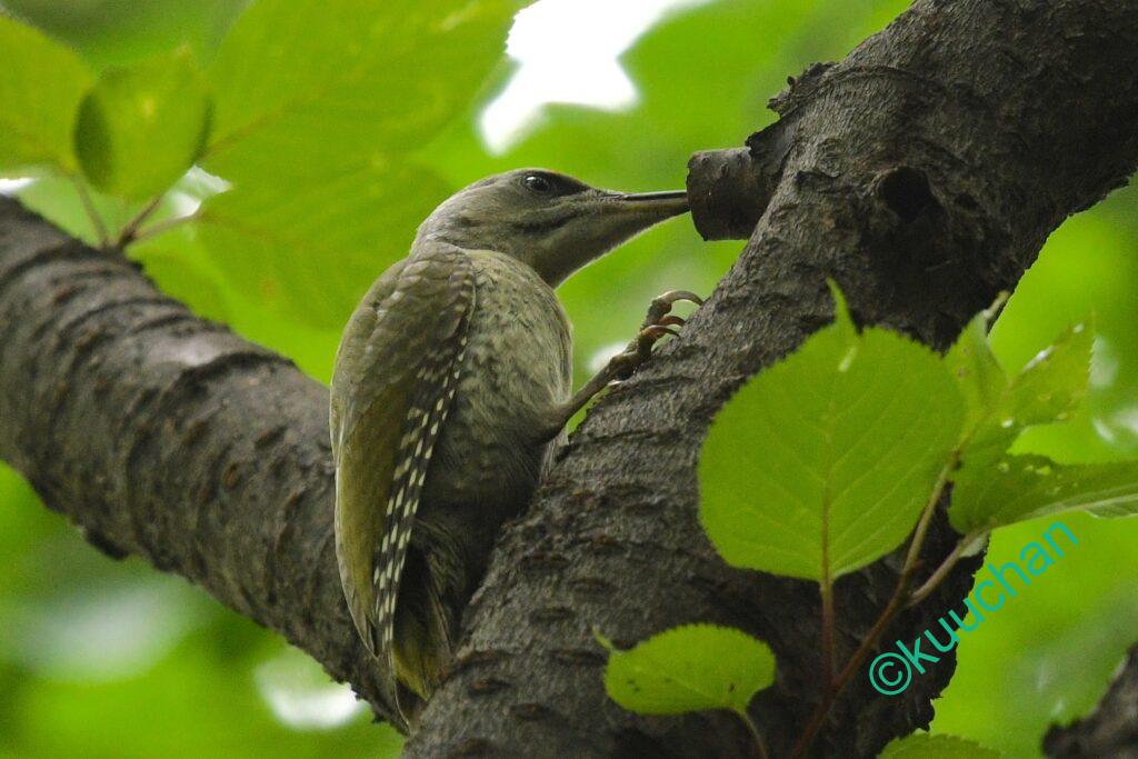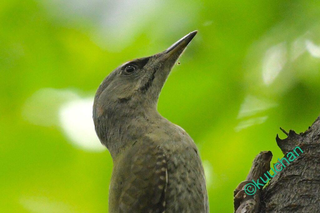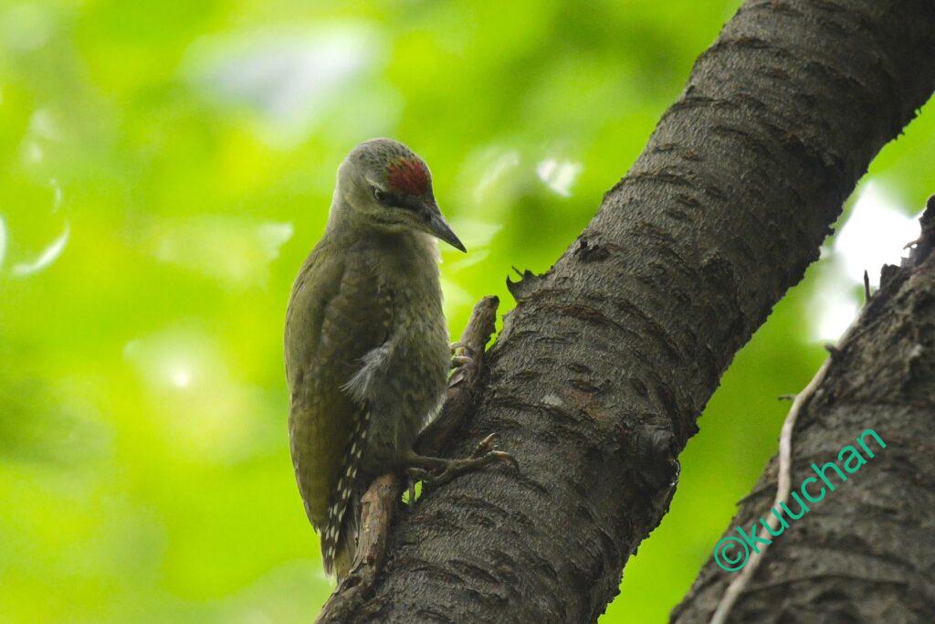 もしかしたらとカメラを向けると、やっぱり!!赤ちゃんアカゲラ、つまりアカゲラの幼鳥です!!