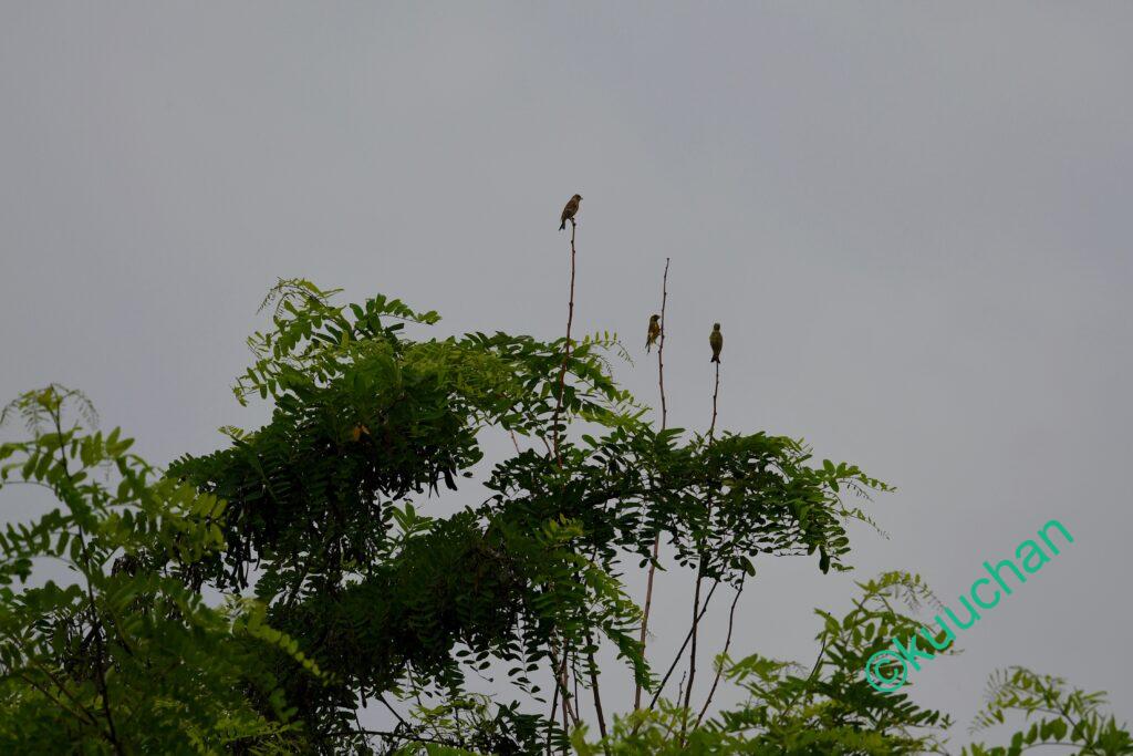 頭上から聞こえてきた声はカワラヒワの群れ。