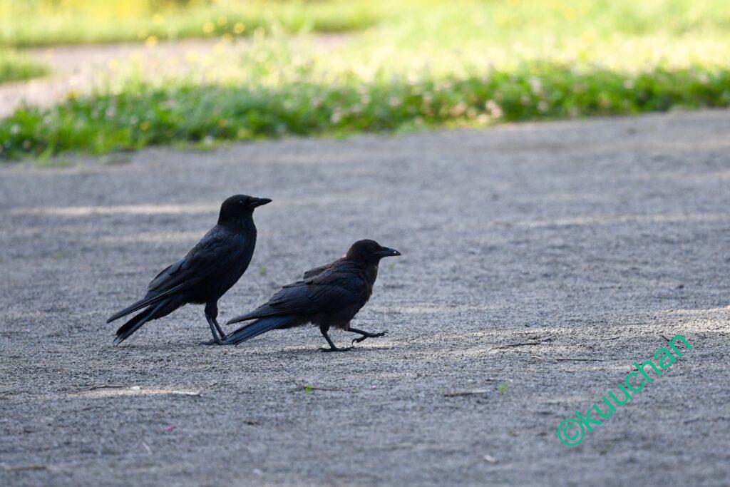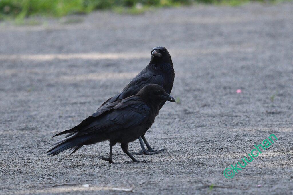 公園には親子のハシボソガラスが。