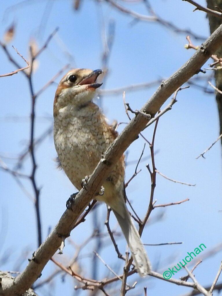 鳥や小さな哺乳類、カエルやトカゲなどを襲い、獲物を串刺しにする「はやにえ」が有名ですが、私が見るのは子育ての時期で、虫が豊富にいるせいか、虫以外の獲物を捕らえているところはあまり見たことがありません。ミミズを掘り出したところに出会ったことはありますが。