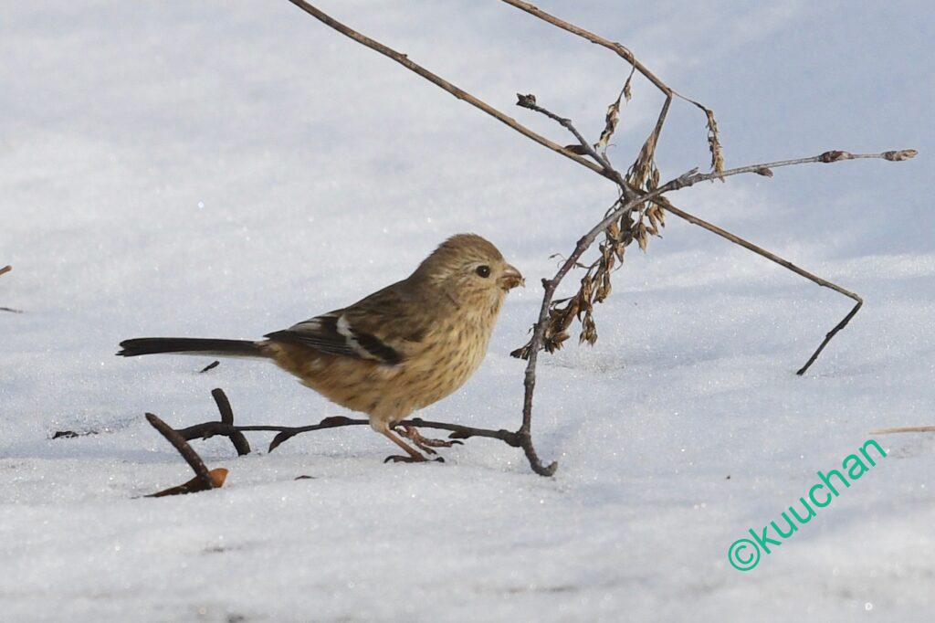 ベニマシコは地面に降りて種などを食べていることも多いです。