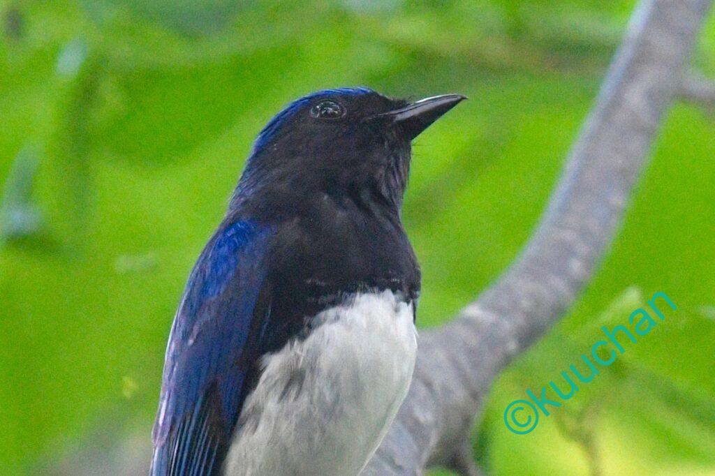 オスはきれいな青色をしています。顔やわき、翼の先端や尾羽の裏などは黒く、おなかは真っ白です。