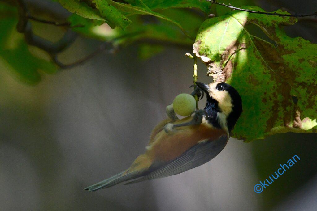 下の写真は、ハクウンボク(?)の実を見つけて、器用に枝から取っているところ。細い枝にとまってくちばしで根元をつまみます。