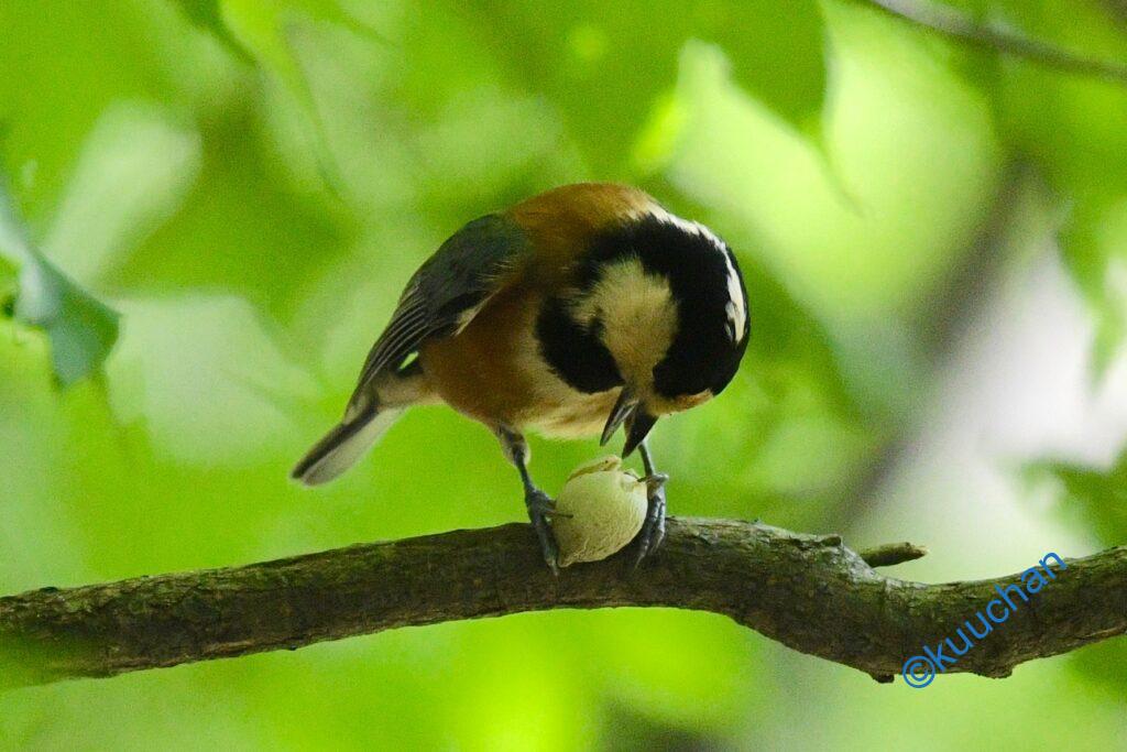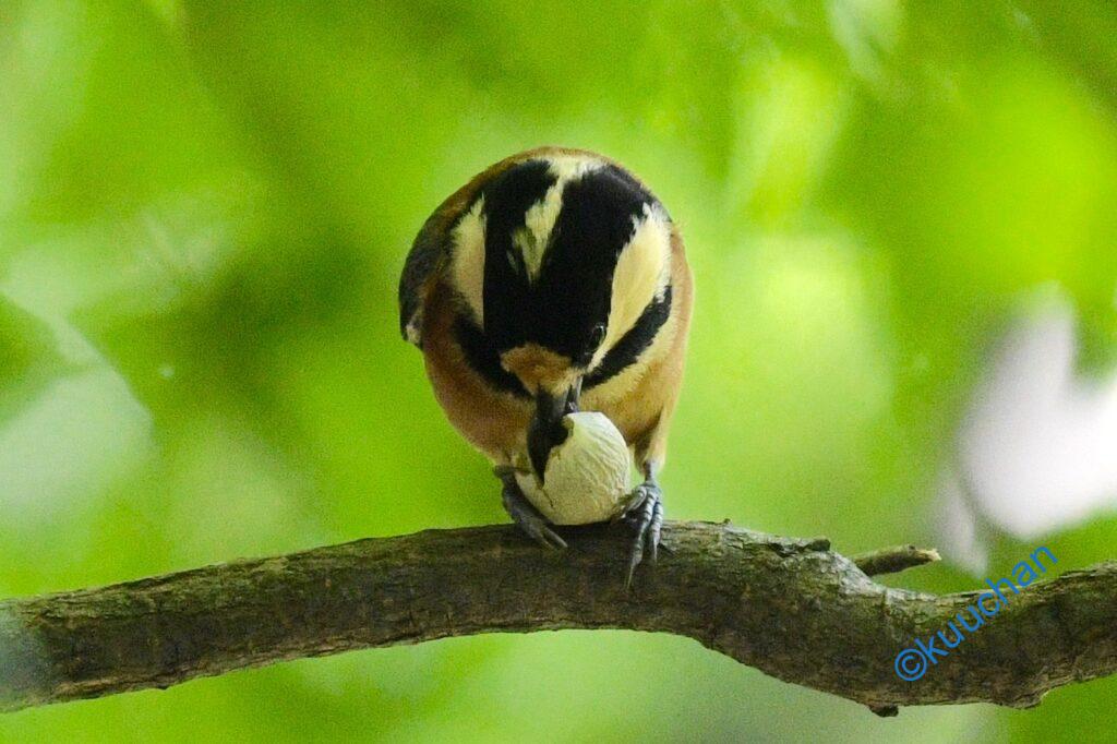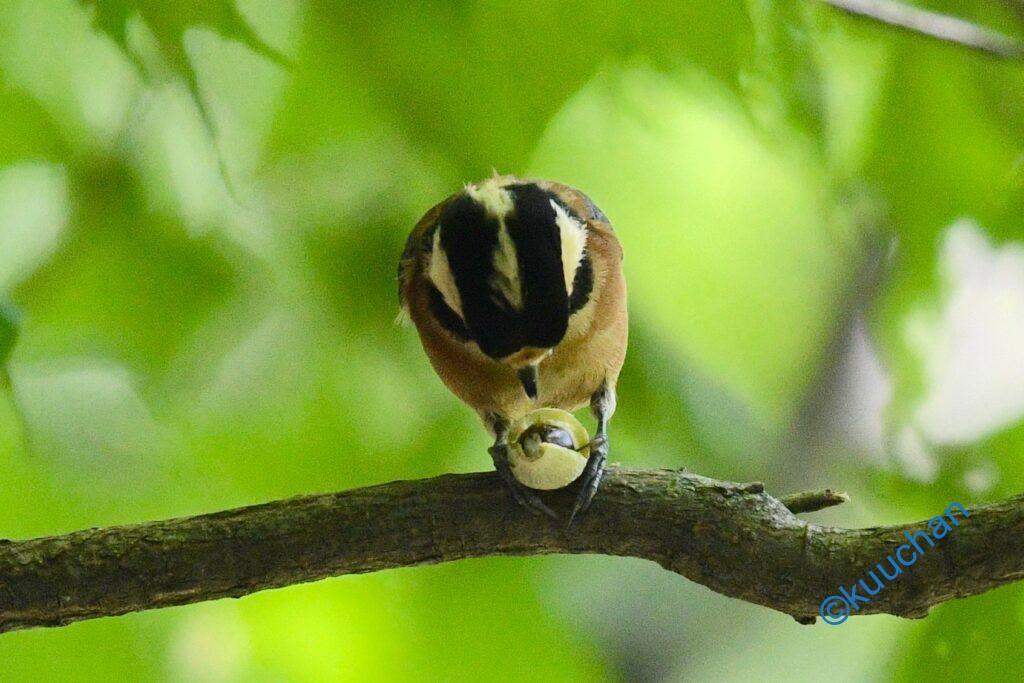 見ていると、両足の間に抱えた実から種を取り出し、しっかり押さえつけてくちばしでたたいて殻を割って中身を食べています。