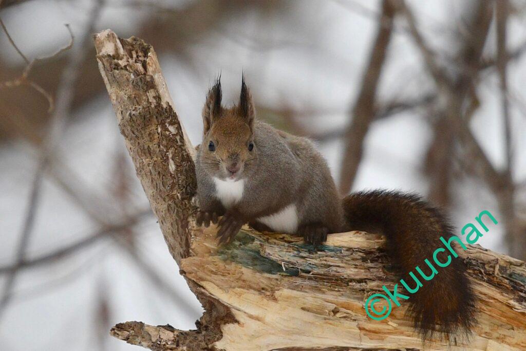 まだちょっとふらつくけれど、心はウキウキで歩いて行くと、さっそく2匹のエゾリスに出会いましたよ。まだ幼く見えるから、今年生まれた兄弟かな?