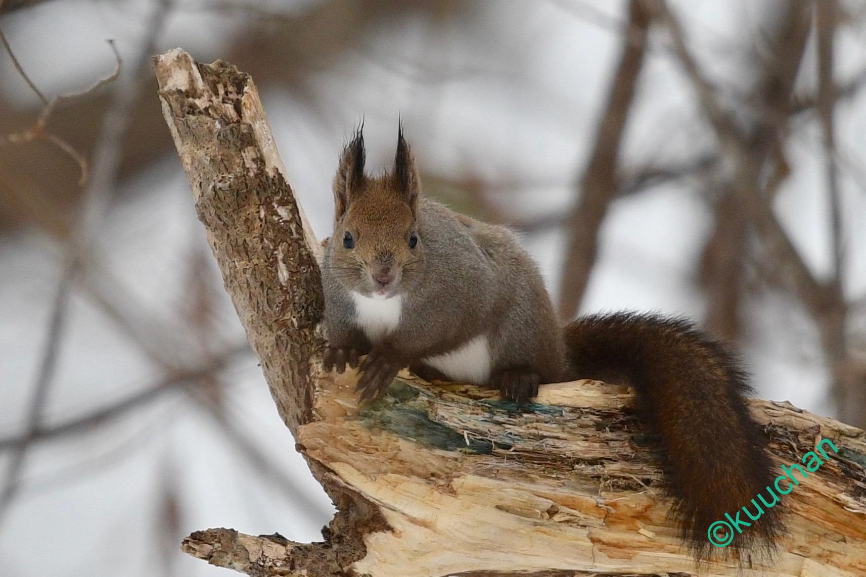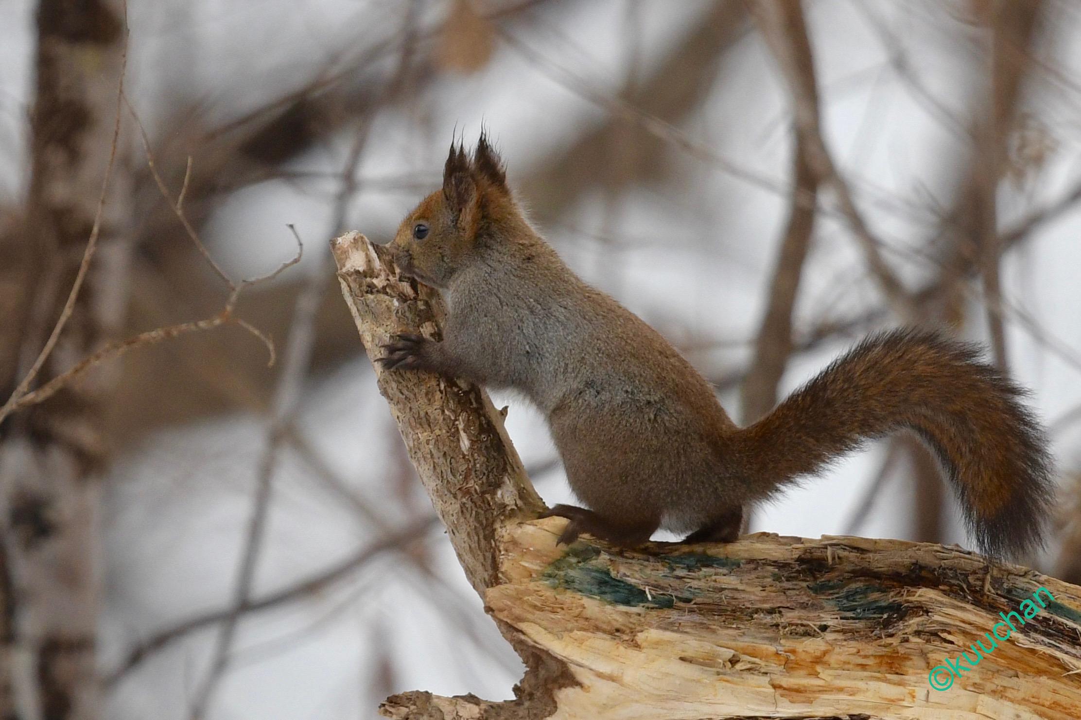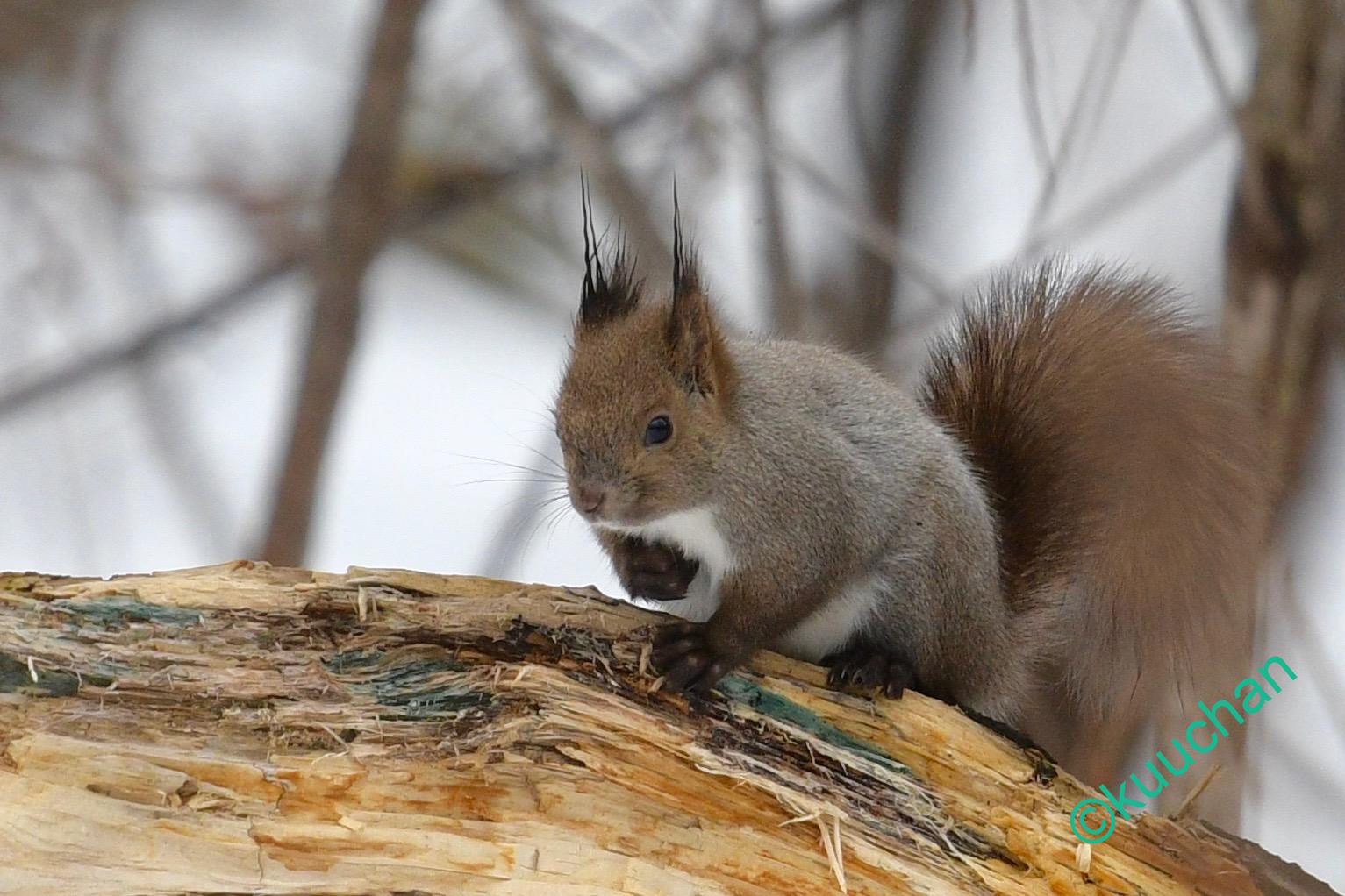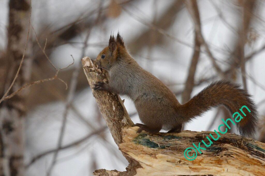 まだちょっとふらつくけれど、心はウキウキで歩いて行くと、さっそく2匹のエゾリスに出会いましたよ。まだ幼く見えるから、今年生まれた兄弟かな?