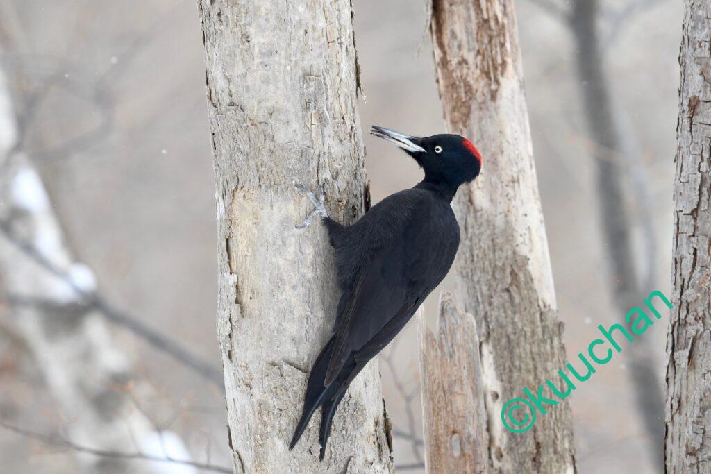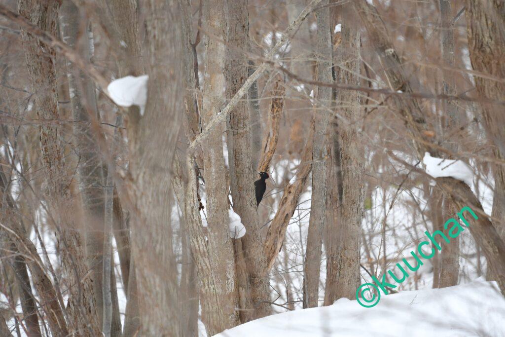 クマゲラに出会う時、たいていは鳴き声や木を掘る音で存在に気がつくことが多いのですが、今日は遠くの木の間をを行ったり来たりしている黒い影が見えました。