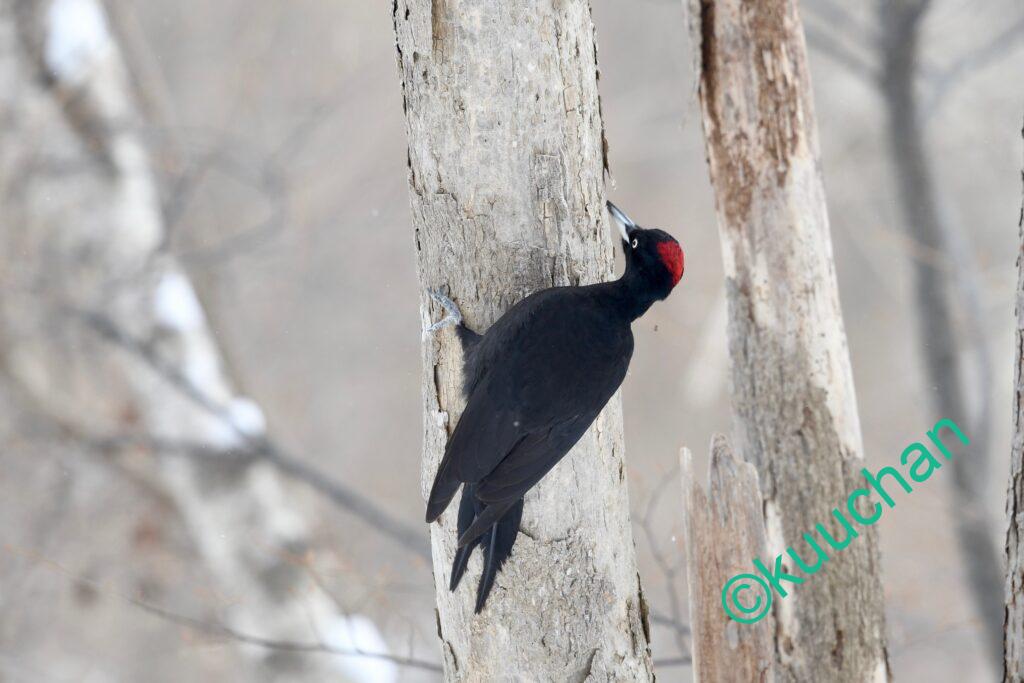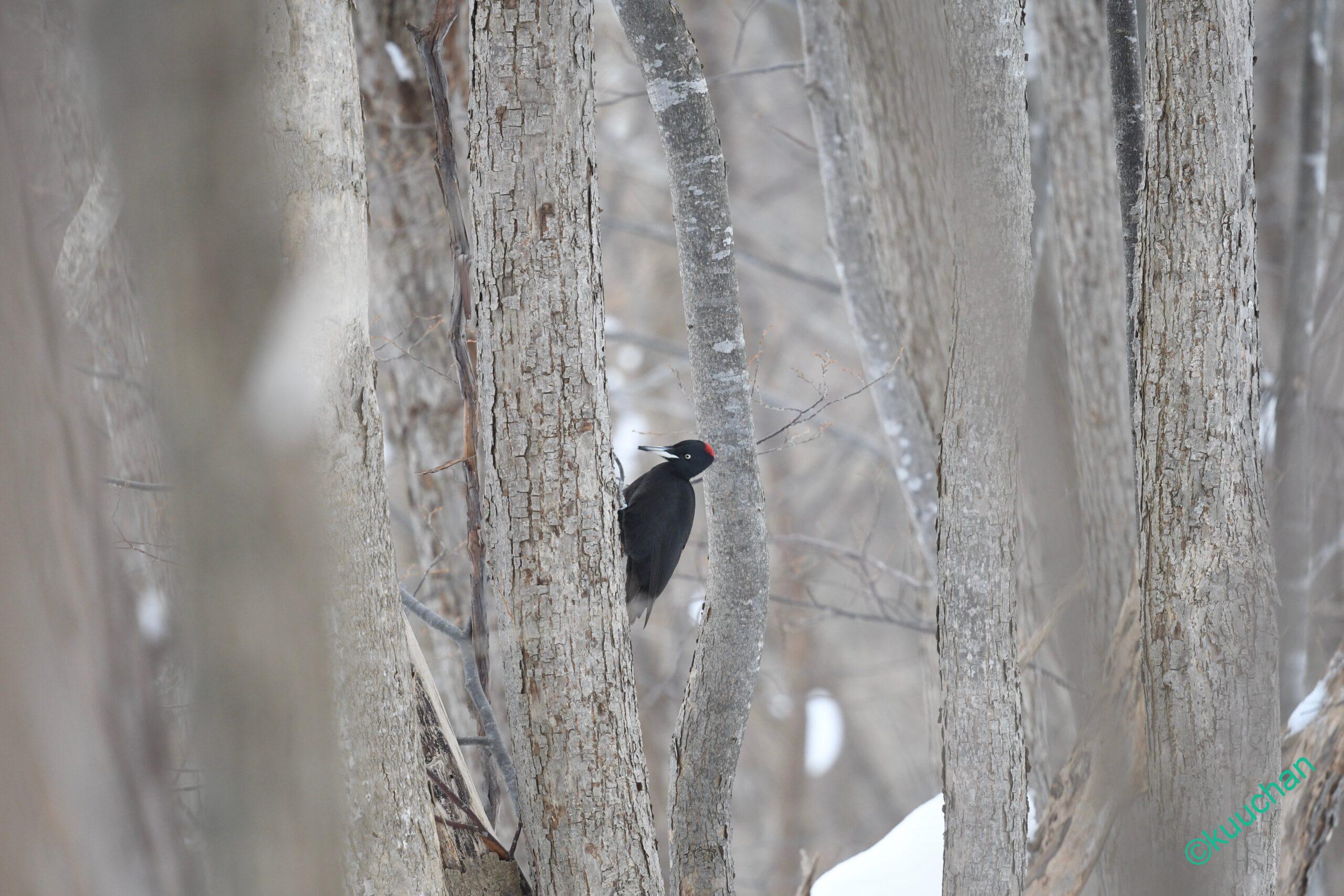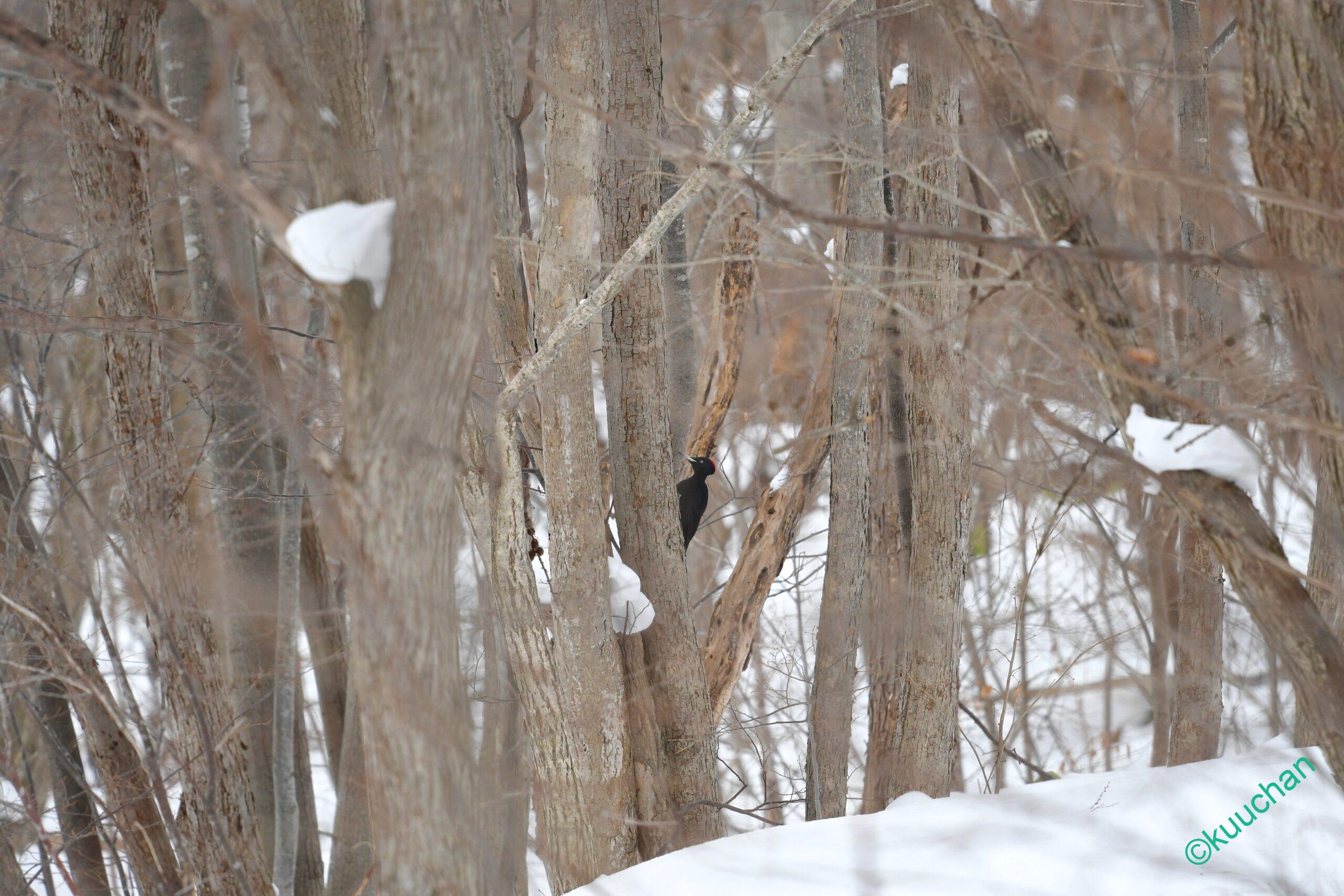 クマゲラに出会う時、たいていは鳴き声や木を掘る音で存在に気がつくことが多いのですが、今日は遠くの木の間をを行ったり来たりしている黒い影が見えました。