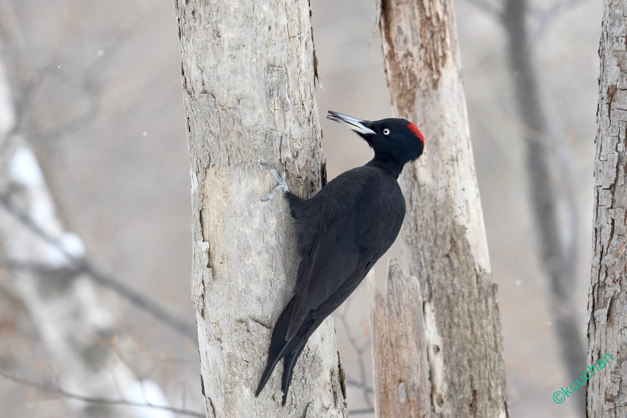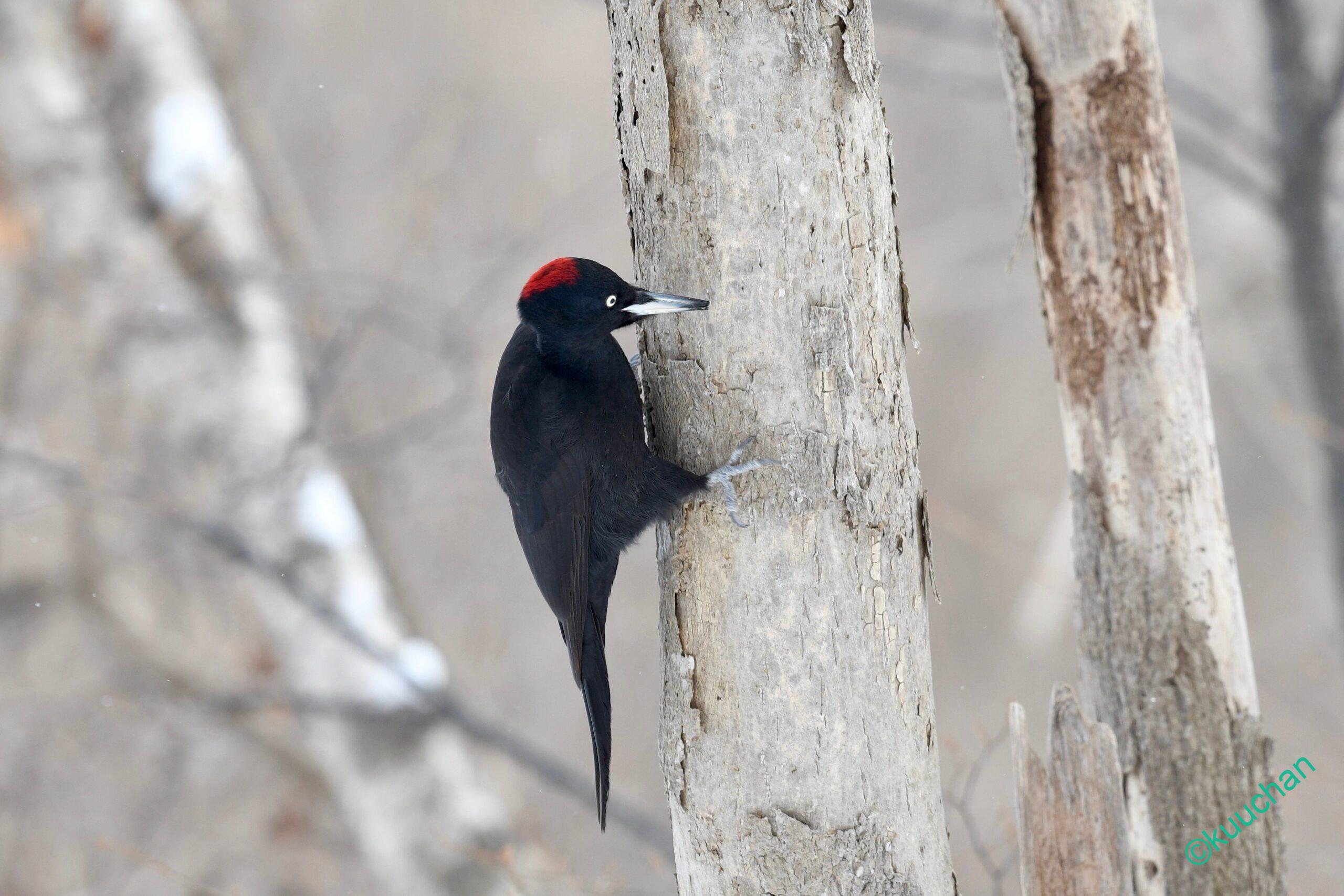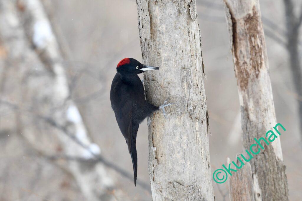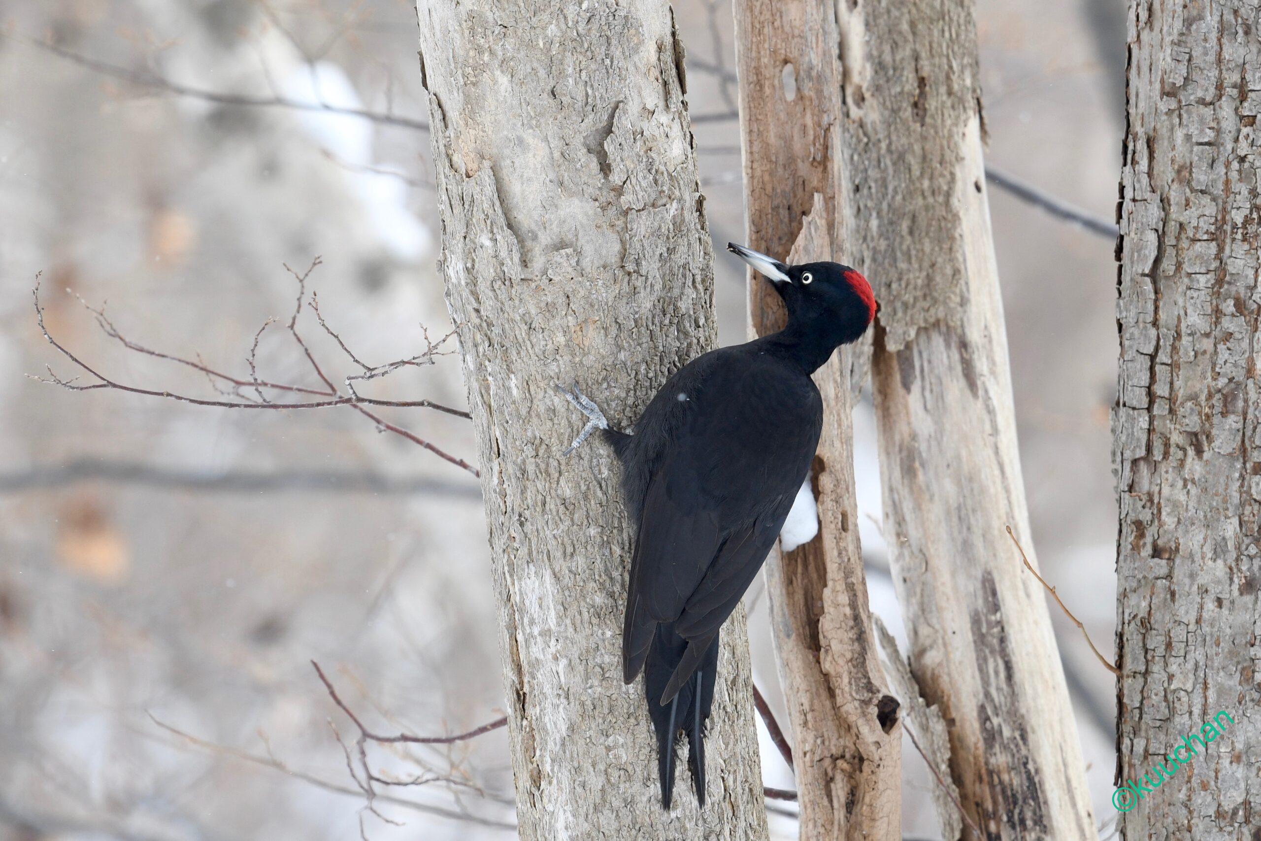 クマゲラに出会う時、たいていは鳴き声や木を掘る音で存在に気がつくことが多いのですが、今日は遠くの木の間をを行ったり来たりしている黒い影が見えました。