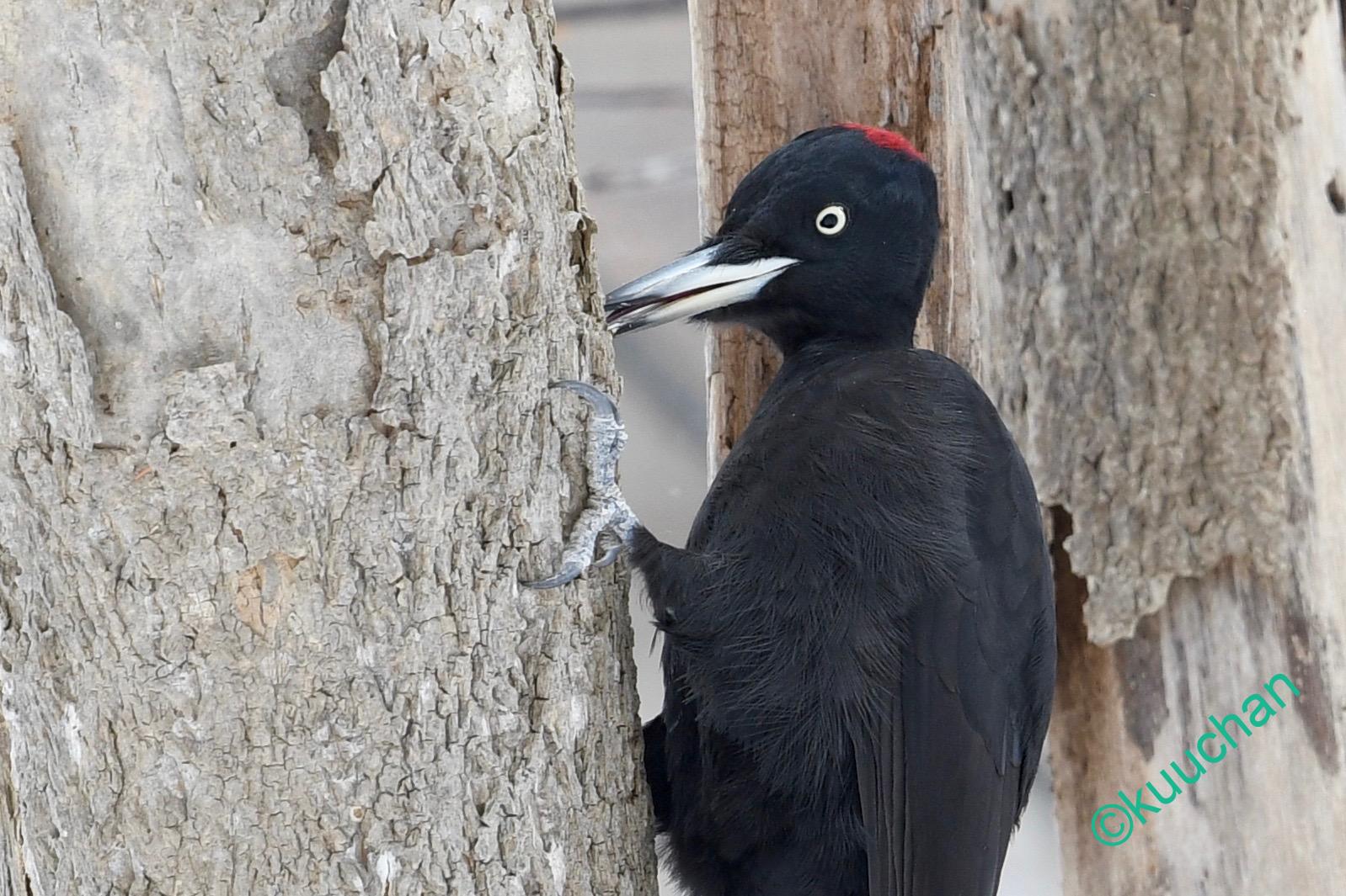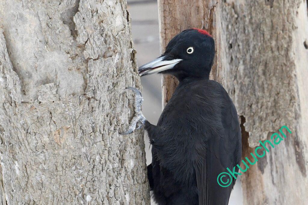 望遠レンズでよく見ると、どうやらメスのクマゲラですね。