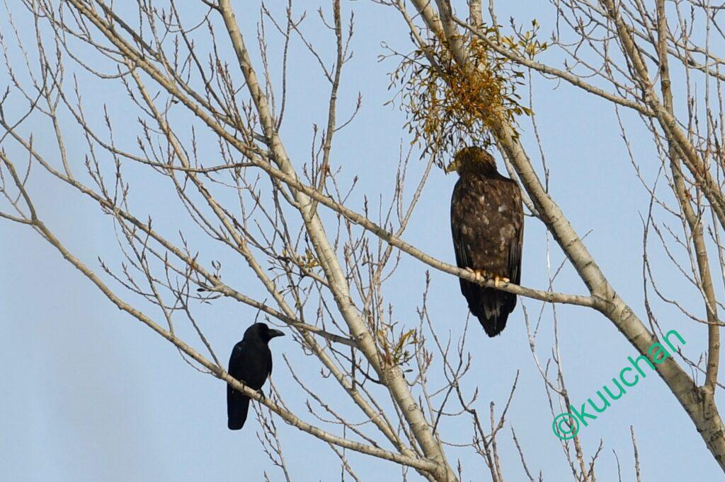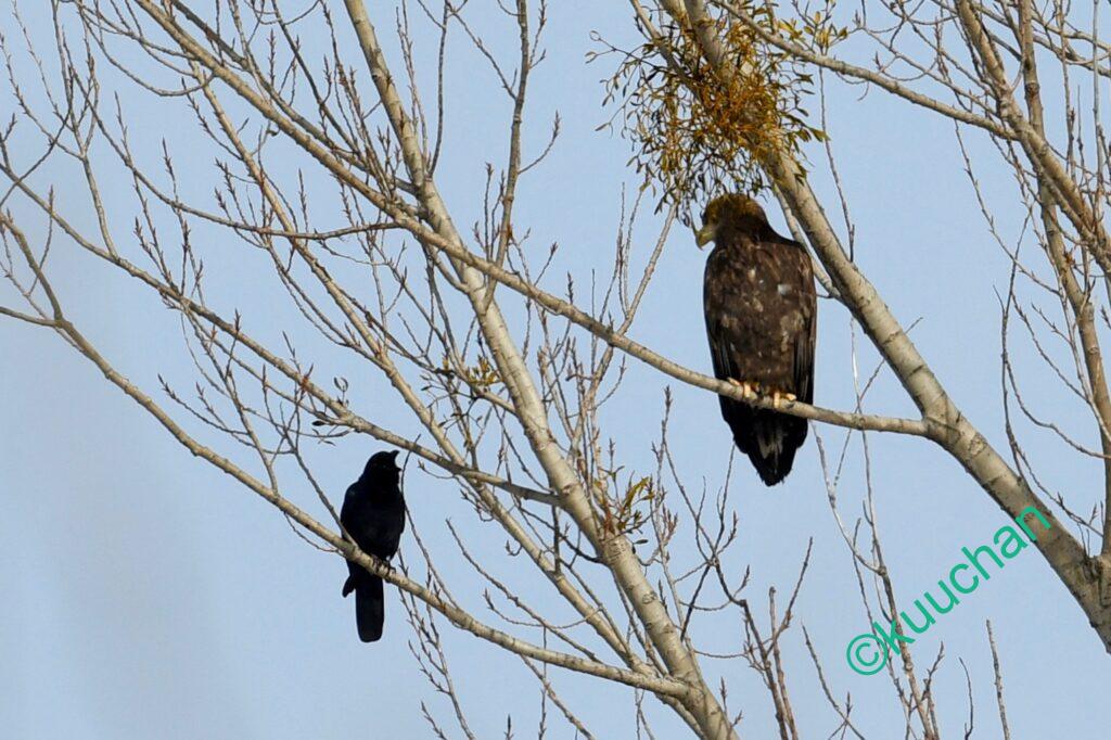 オジロワシが来ると、騒いで追い出しにかかるカラスまで今日は静かに隣にとまっています。まあ威嚇しているのでしょうけど。