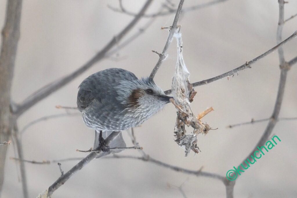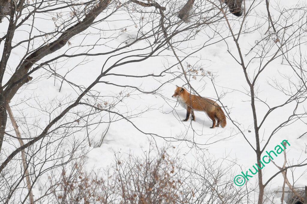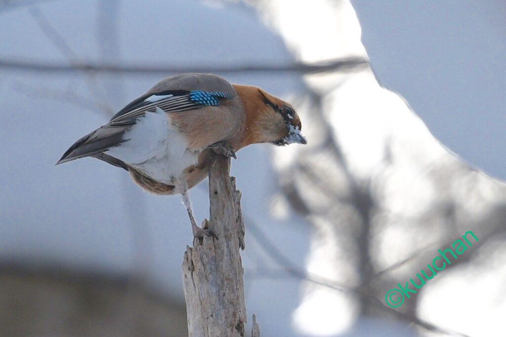 先月、1月7日の日記で書いた、リスがイタドリに挟んだクルミですが、結局食べないまま雪に埋もれそうになっていて、いいのかな〜と眺めていたら変な声が…。