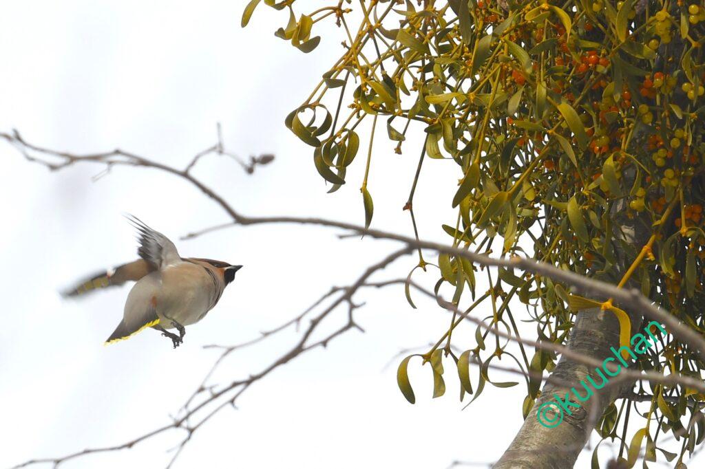 下の写真のように、ヤドリギの実に集まっている時の方がゆっくり観察できるので好きです。