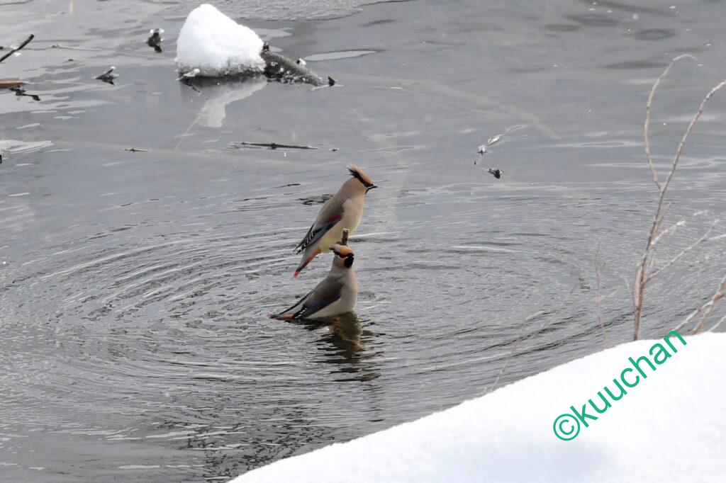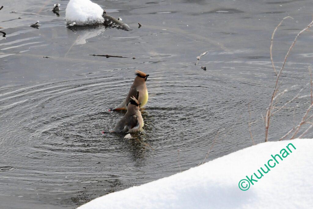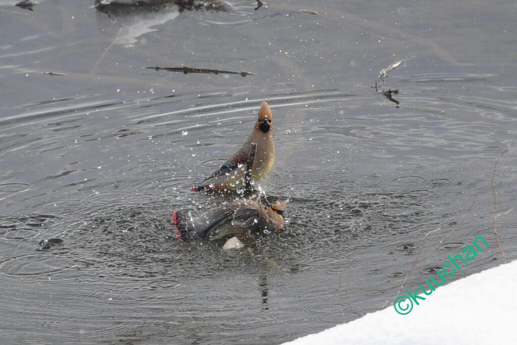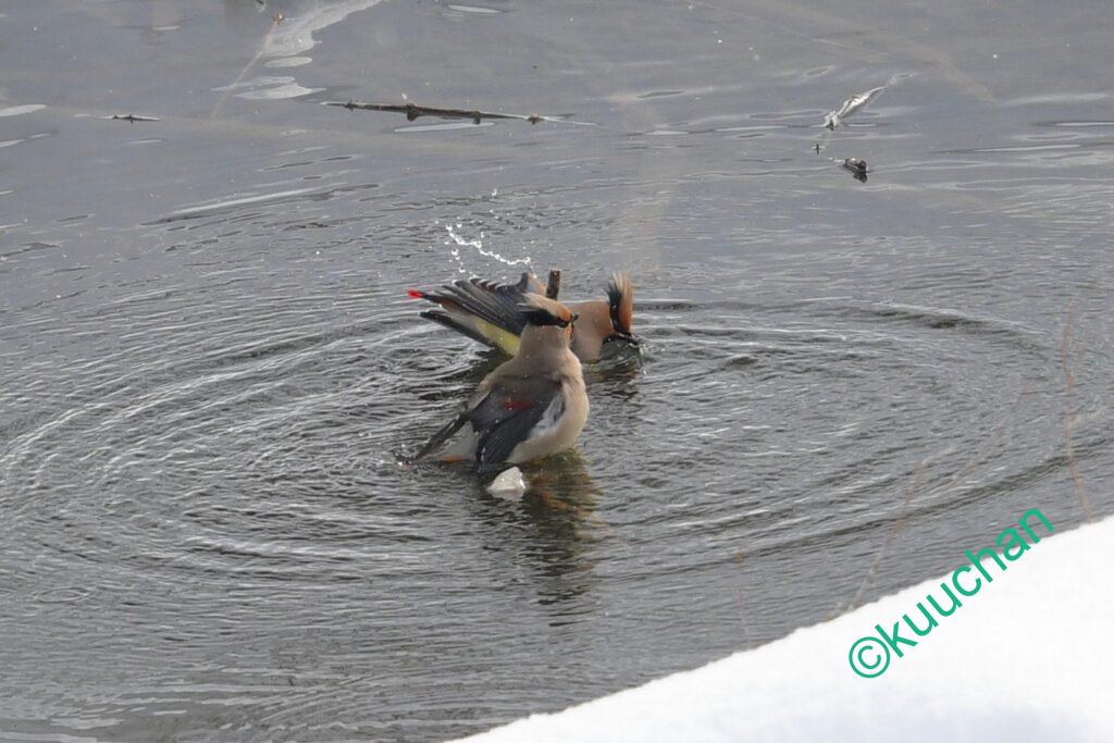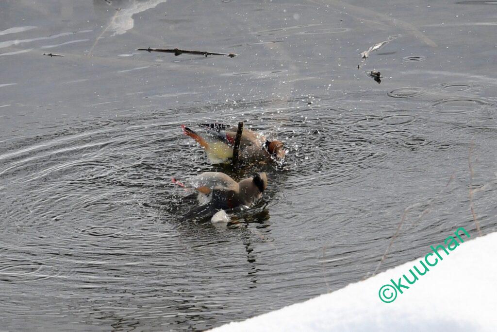 この時は、二羽のヒレンジャクが沈んでいる木にとまって、一緒に水浴び!!
