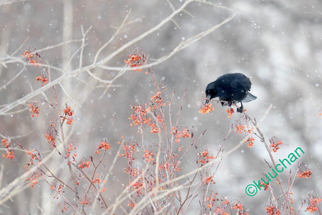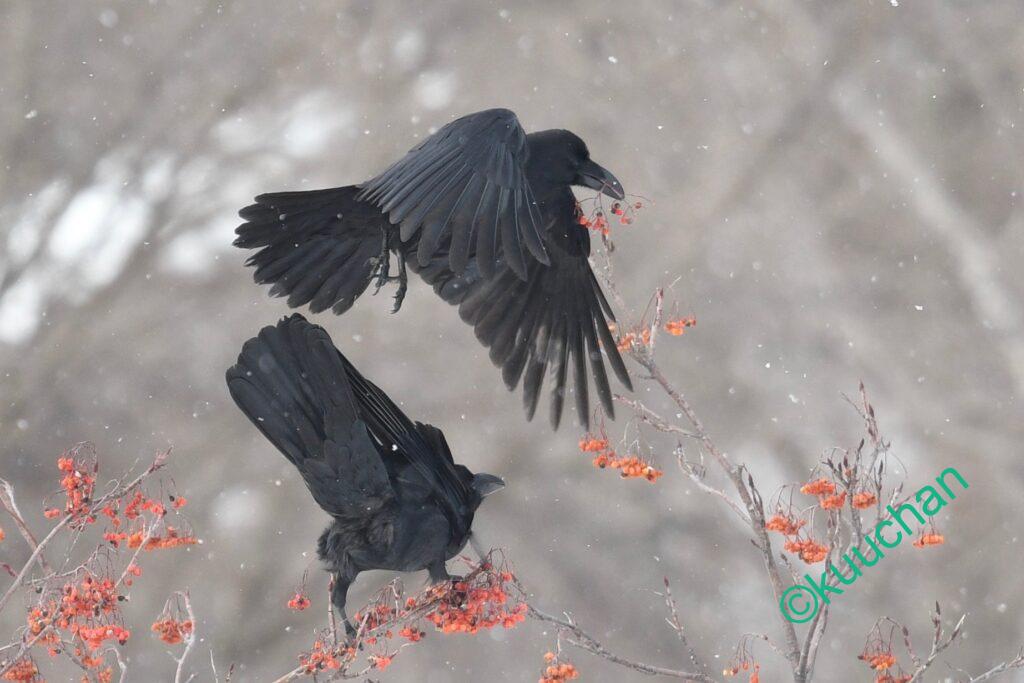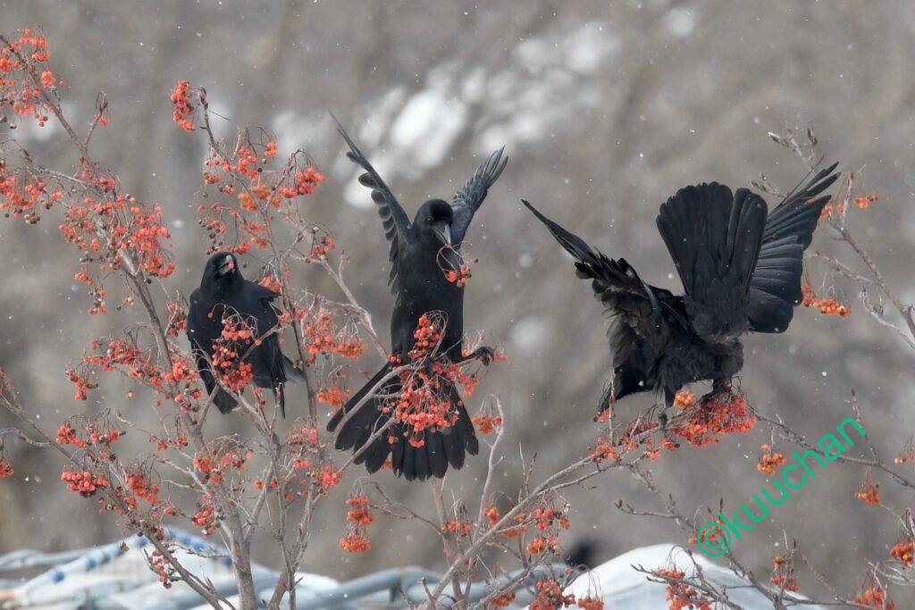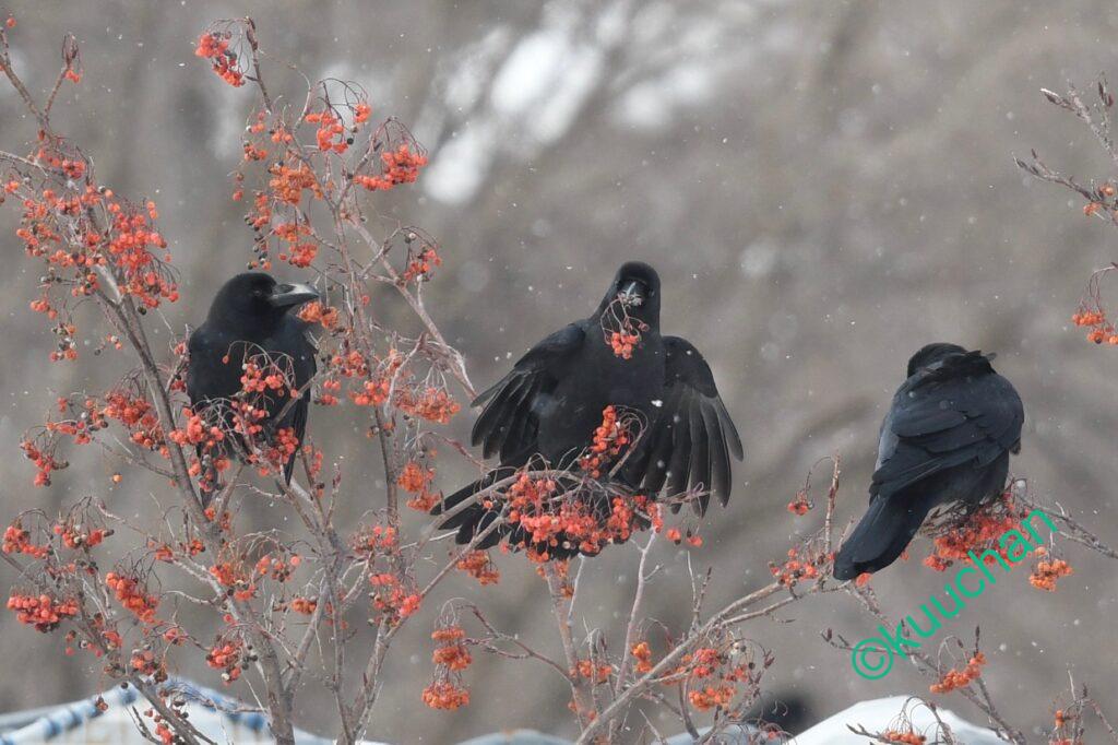 今回はナナカマドの木に集まって、楽しげに実を食べていたカラスたち。