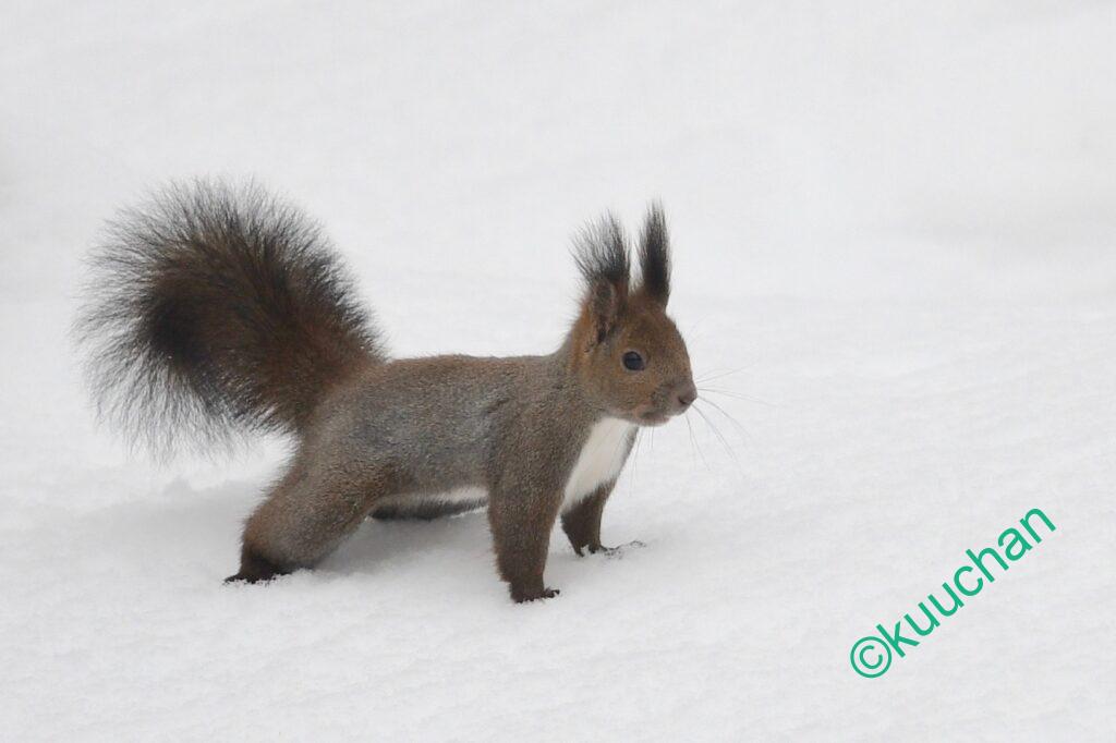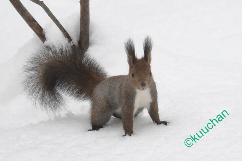 これはリスの警戒音だなと辺りを見回すと、いたいた、2匹のエゾリスです。