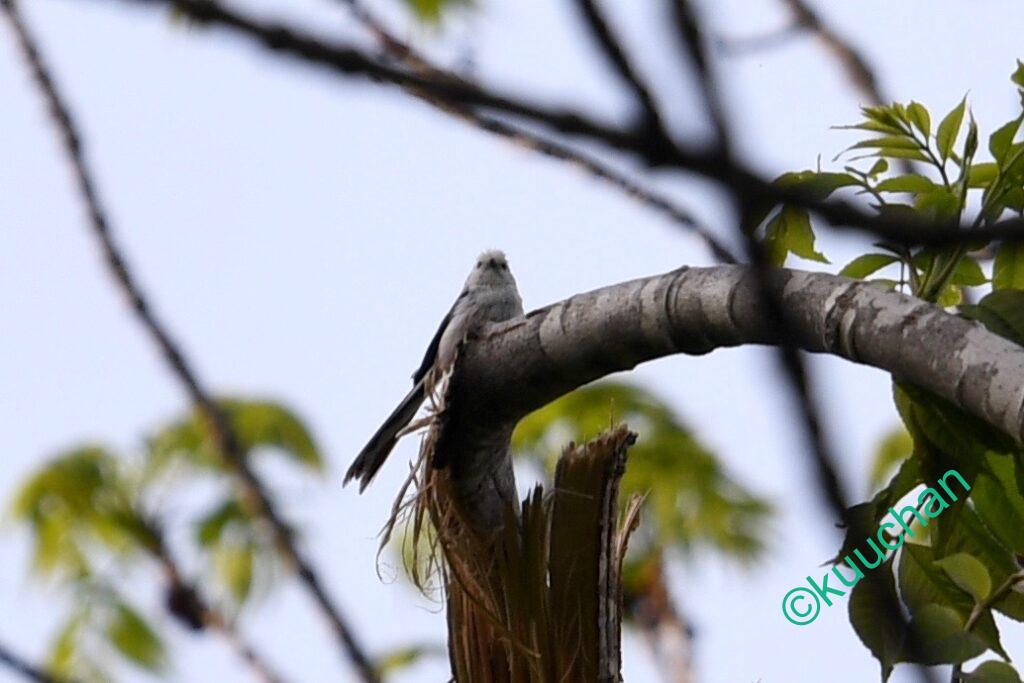 ですが、樹上高くから聞こえる声の主は見えません。低い場所に飛んできてくれないかなと見上げて待ちました。