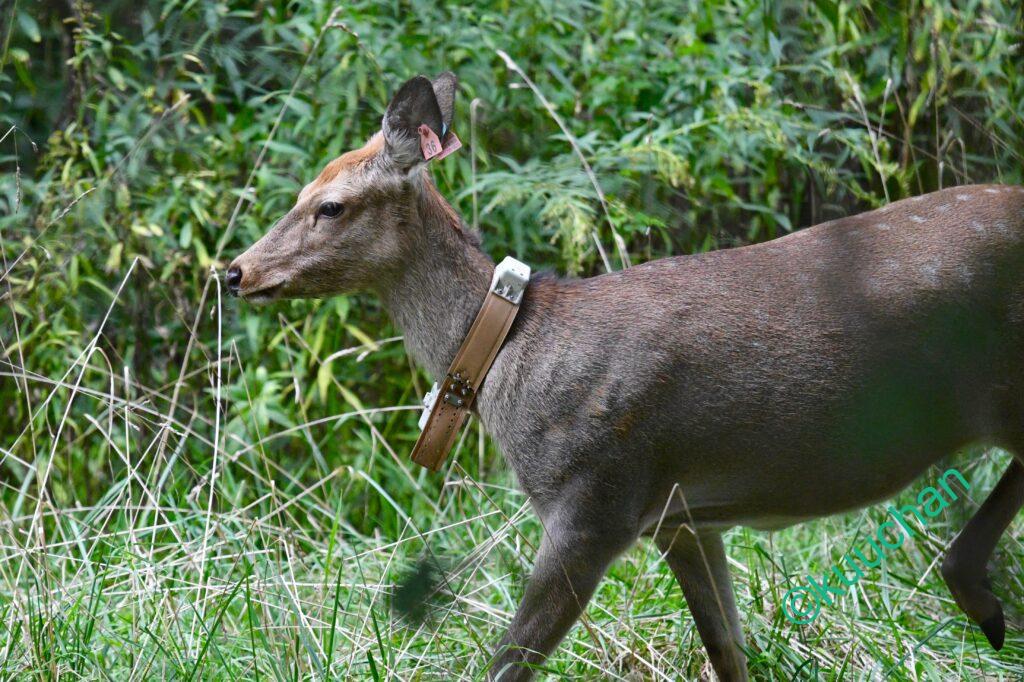 最近、上の写真のような発信器をつけたエゾシカを見ることが増えました。