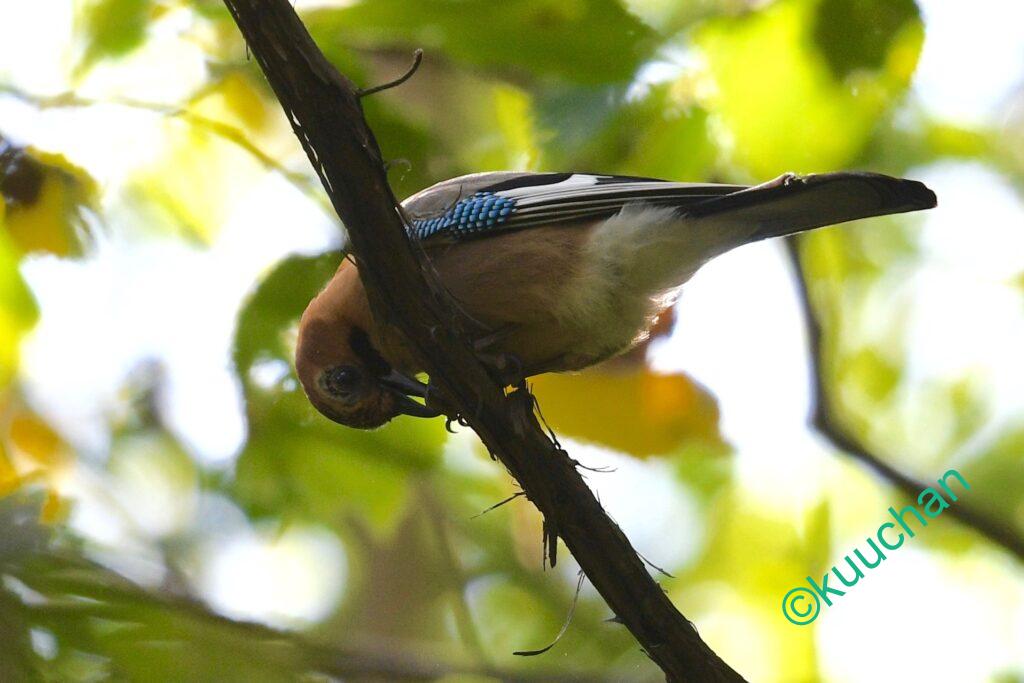 近くではカケスが冬の食料を貯食中。ドングリをヤマブドウのつるにはさんでいました。