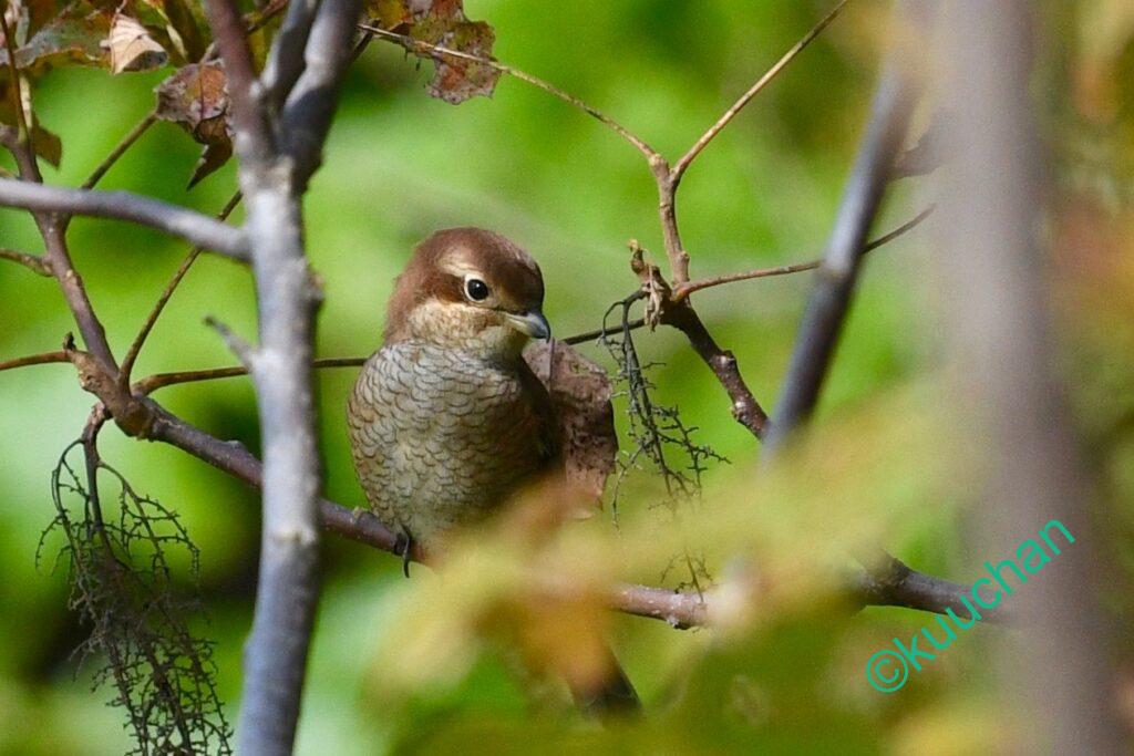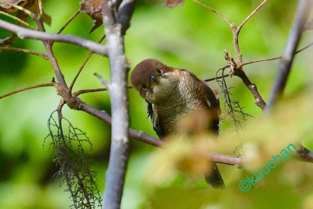 シギを見送った先にはメスのモズが羽繕いしていましたよ。頭がかゆいかゆい。