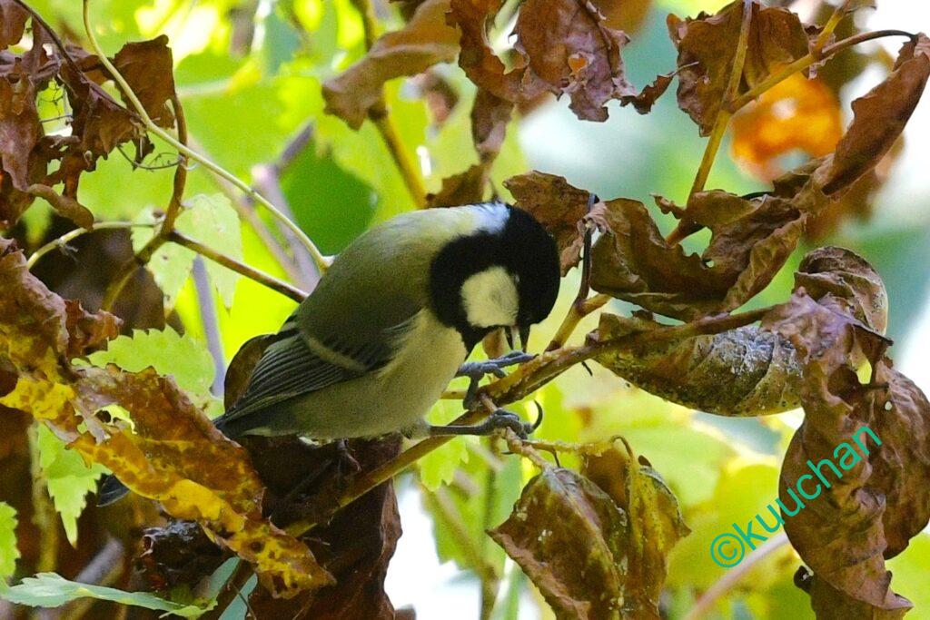 カラたちは今日も元気。シジュウカラが葉っぱを食べているように見えたので、よーく見ると、なるほど葉や茎についている小さな小さな虫の卵を食べていたのですね。