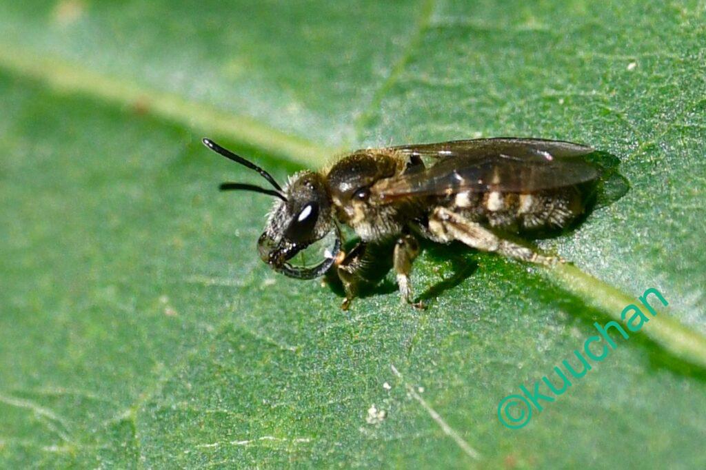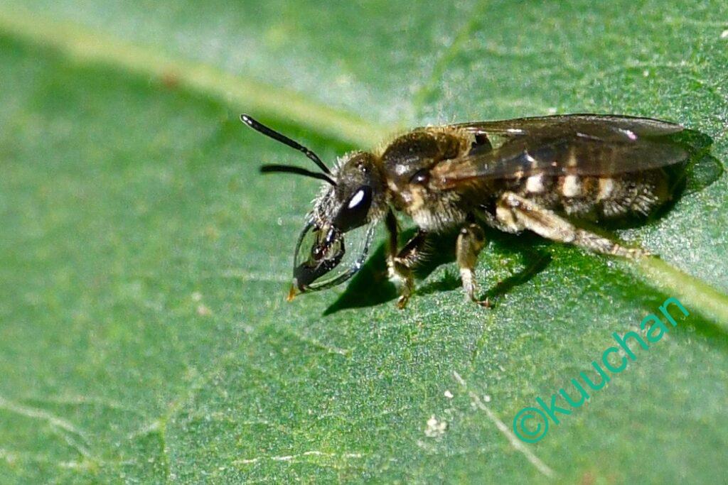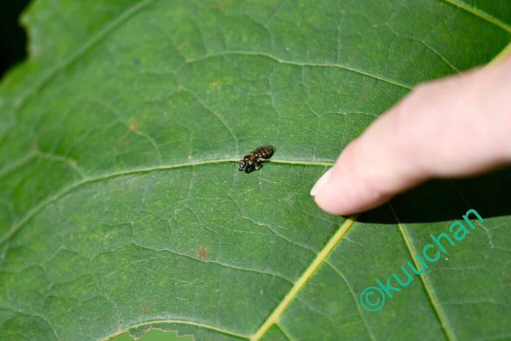 葉っぱの上に小さなキラキラしたものがあって、近づくとハチが水をくわえている??