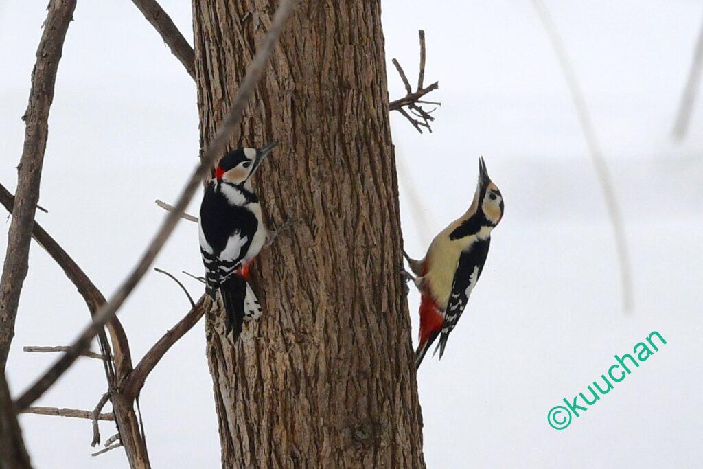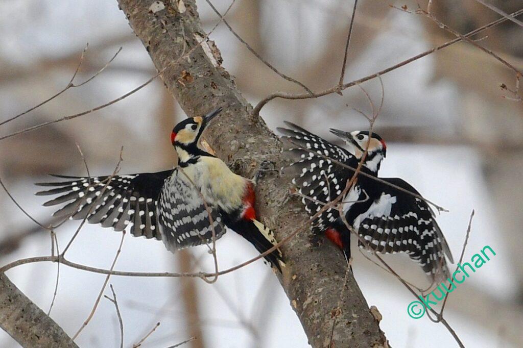 今日は、アカゲラのオスが力比べをしていましたよ。