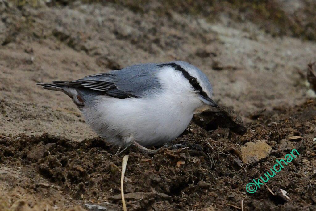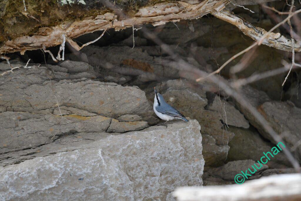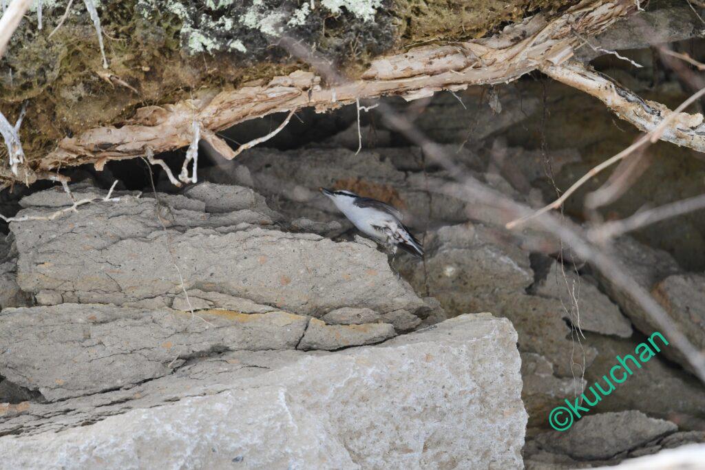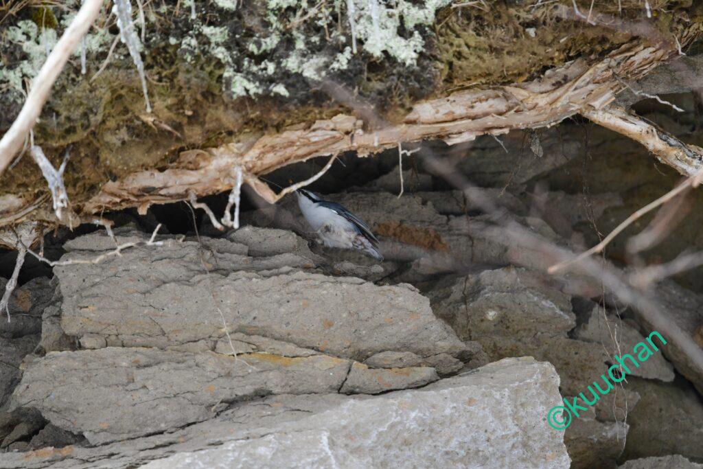 少し歩くと、急斜面の岩穴でゴジュウカラがなにかしていました。