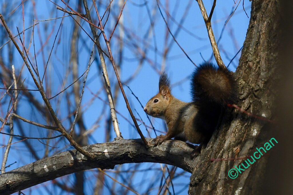 帰り道、私の立っていた場所の横の木に、エゾリスが登って行きました。