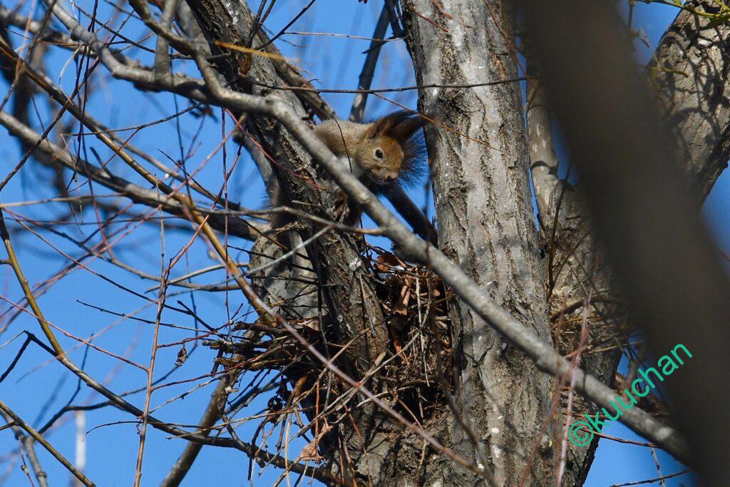 先日も書いたエゾリスの巣ですが、今日も別の場所で巣に入っていくエゾリスに会いましたよ。