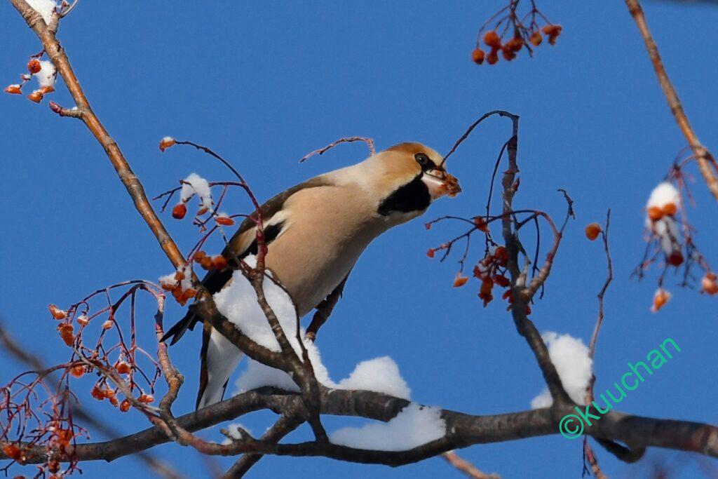 アトリとマヒワとカワラヒワはシラカバの種。ツグミとシメとヒヨドリはナナカマドの実を夢中で食べています。